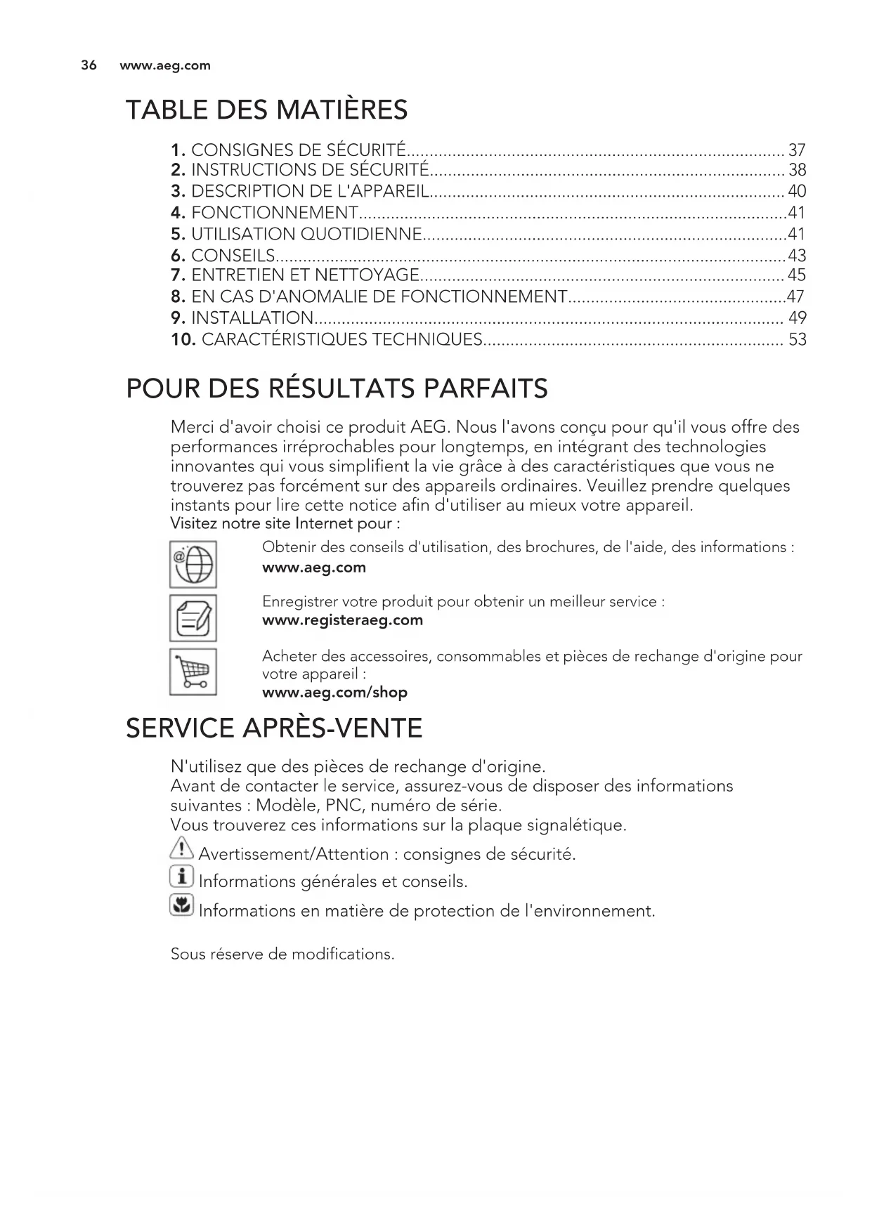 N'utilisez que des pièces de rechange d'origine. Avant de contacter le service, assurez-vous de disposer des informations suivantes : Modèle, PNC, numéro de série. Vous trouverez ces informations sur la plaque signalétique. Avertissement/Attention : consignes de sécurité. Informations générales et conseils. Informations en matière de protection de l'environnement. Sous réserve de modifications. www.aeg.com