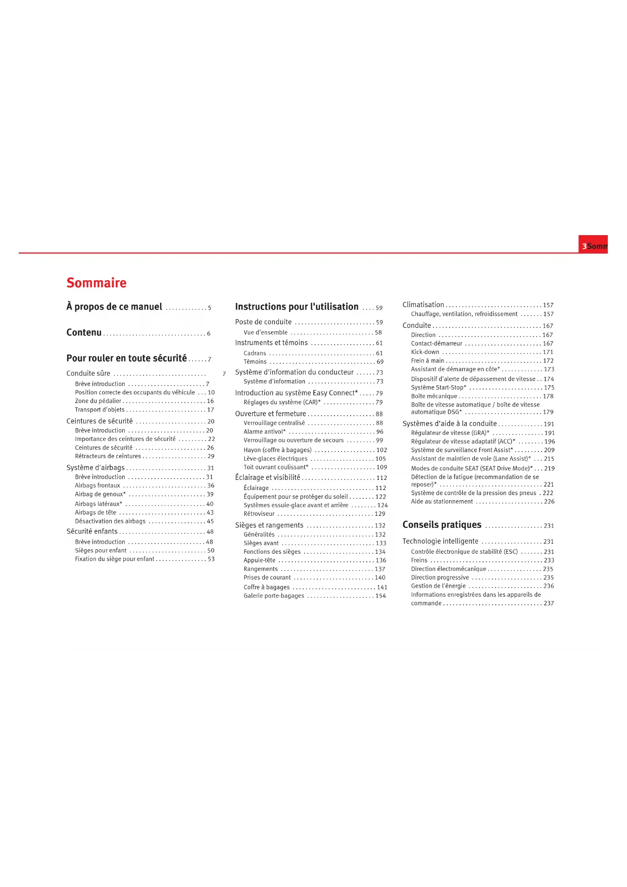 - Vue d'ensemble (poste de conduite) 350 Index alphabétiqueLe but de SEAT S.A. étant le développement constant de tous ses types et modèles de véhicules, vous comprendrez que cela peut nous amener à tout moment à réaliser des modifications concernant l’apparence, l’équipement et la technique du véhicule fourni. Par conséquent, nul droit ne pourra se fonder sur les données, les illustrations et les descriptions contenues dans ce Manuel. Les textes, les illustrations et les normes contenus dans ce manuel ont été réalisés sur la base des informations disponibles au moment de l’impression. Sauf erreur ou omission, l’information rassemblée dans le présent manuel est valable à la date de mise sous presse. SEAT interdit la réimpression, la reproduction et la traduction totale ou partielle sans son autorisation écrite. SEAT se réserve expressément tous les droits conformément à la loi sur le “Copy right”. Droits aux modifications réservés. p. 59