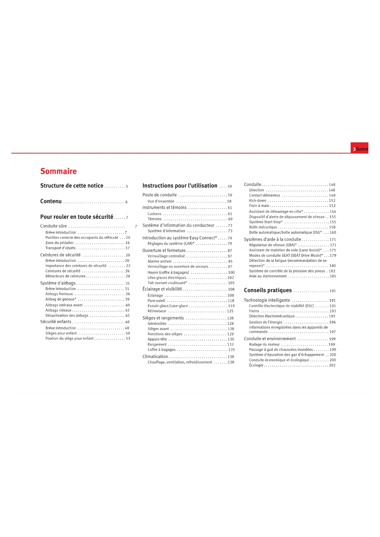 - Vue d'ensemble (poste de conduite) 302 Index alphabétiqueLe but de SEAT S.A. étant le développement constant de tous ses types et modèles de véhicules, vous comprendrez que cela peut nous amener à tout moment à réaliser des modifications concernant l’apparence, l’équipement et la technique du véhicule fourni. Par conséquent, nul droit ne pourra se fonder sur les données, les illustrations et les descriptions contenues dans ce Manuel. Les textes, les illustrations et les normes contenus dans ce manuel ont été réalisés sur la base des informations disponibles au moment de l’impression. Sauf erreur ou omission, l’information rassemblée dans le présent manuel est valable à la date de mise sous presse. SEAT interdit la réimpression, la reproduction et la traduction totale ou partielle sans son autorisation écrite. SEAT se réserve expressément tous les droits conformément à la loi sur le “Copy right”. Droits aux modifications réservés. p. 59
