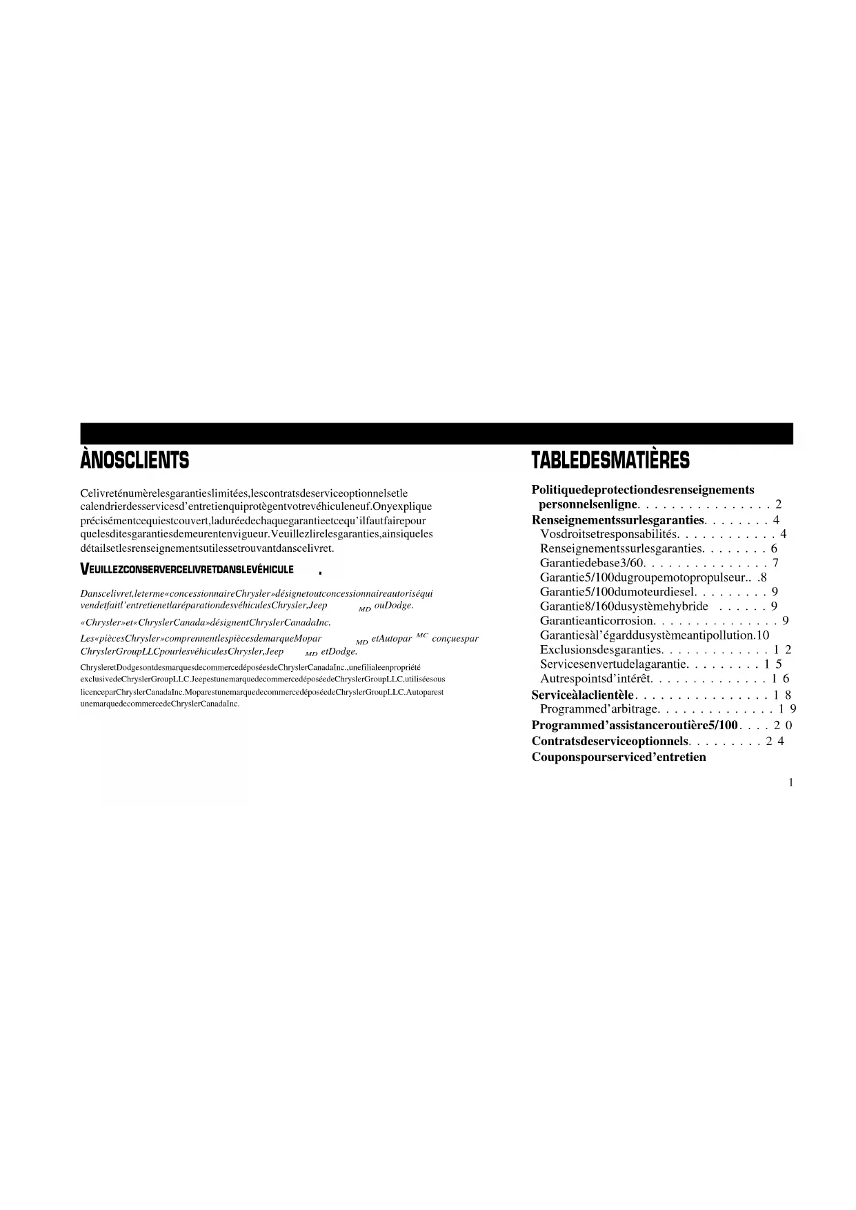 Les garanties limitées décrites dans ce livret sont les seules garanties expresses accordées par Chrysler Canada Inc. à l'égard de ce véhicule. La durée de toute garantie implicite de qualité marchande ou d'adaptabilité à une fin particulière applicable au véhicule est limitée à la durée des garanties limitées.