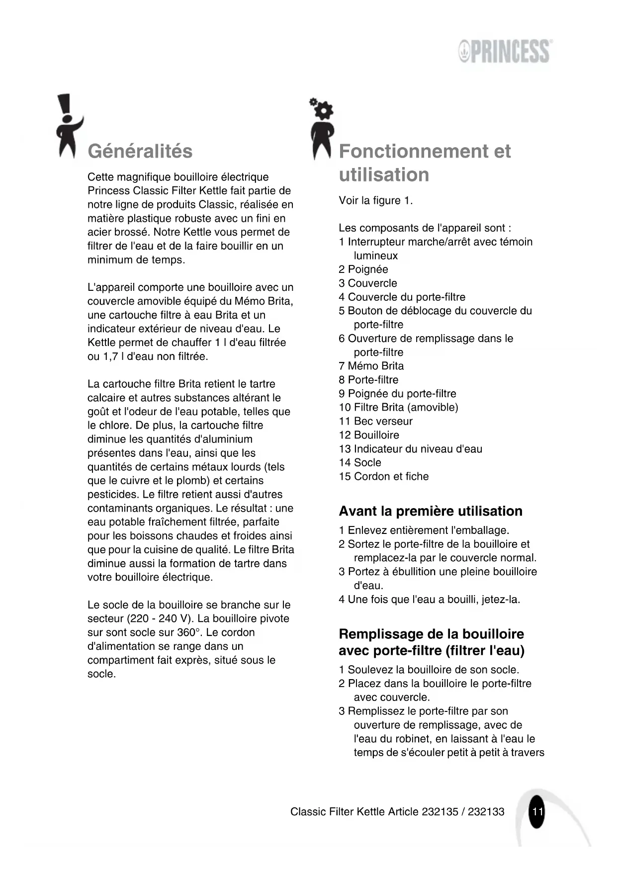 - 2002/95/EC10 Classic Filter Kettle Article 232135 / 23213311 Classic Filter Kettle Article 232135 / 232133 Généralités Cette magnifique bouilloire électrique Princess Classic Filter Kettle fait partie de notre ligne de produits Classic, réalisée en matière plastique robuste avec un fini en acier brossé. Notre Kettle vous permet de filtrer de l'eau et de la faire bouillir en un minimum de temps. L'appareil comporte une bouilloire avec un couvercle amovible équipé du Mémo Brita, une cartouche filtre à eau Brita et un indicateur extérieur de niveau d'eau. Le Kettle permet de chauffer 1 l d'eau filtrée ou 1,7 l d'eau non filtrée. La cartouche filtre Brita retient le tartre calcaire et autres substances altérant le goût et l'odeur de l'eau potable, telles que le chlore. De plus, la cartouche filtre diminue les quantités d'aluminium présentes dans l'eau, ainsi que les quantités de certains métaux lourds (tels que le cuivre et le plomb) et certains pesticides. Le filtre retient aussi d'autres contaminants organiques. Le résultat : une eau potable fraîchement filtrée, parfaite pour les boissons chaudes et froides ainsi que pour la cuisine de qualité. Le filtre Brita diminue aussi la formation de tartre dans votre bouilloire électrique. Le socle de la bouilloire se branche sur le secteur (220 - 240 V). La bouilloire pivote sur sont socle sur 360°. Le cordon d'alimentation se range dans un compartiment fait exprès, situé sous le socle. Fonctionnement et utilisation Voir la figure 1. Les composants de l'appareil sont : 1 Interrupteur marche/arrêt avec témoin lumineux 2 Poignée 3 Couvercle 4 Couvercle du porte-filtre 5 Bouton de déblocage du couvercle du porte-filtre 6 Ouverture de remplissage dans le porte-filtre 7 Mémo Brita 8 Porte-filtre 9 Poignée du porte-filtre 10 Filtre Brita (amovible) 11 Bec verseur 12 Bouilloire 13 Indicateur du niveau d'eau 14 Socle 15 Cordon et fiche Avant la première utilisation 1 Enlevez entièrement l'emballage. 2 Sortez le porte-filtre de la bouilloire et remplacez-la par le couvercle normal. 3 Portez à ébullition une pleine bouilloire d'eau. 4 Une fois que l'eau a bouilli, jetez-la. Remplissage de la bouilloire avec porte-filtre (filtrer l'eau) 1 Soulevez la bouilloire de son socle. 2 Placez dans la bouilloire le porte-filtre avec couvercle. 3 Remplissez le porte-filtre par son ouverture de remplissage, avec de l'eau du robinet, en laissant à l'eau le temps de s'écouler petit à petit à travers12 Classic Filter Kettle Article 232135 / 232133 le filtre. Faites attention à ne pas mouiller le socle. 4 Lorsque vous chauffez de l'eau filtrée, mettez dans la bouilloire au moins 0,7 l d'eau, et au plus 1 l, pour ne pas l'endommager. Remplissage de la bouilloire sans porte-filtre 1 Soulevez la bouilloire de son socle. 2 Sortez le porte-filtre de la bouilloire, au moyen de la poignée. 3 Remplissez la bouilloire de la quantité d'eau désirée. Mettez au moins 0,7 l dans la bouilloire, et au plus 1,7 l, pour ne pas l'endommager. Faites attention à ne pas mouiller le socle. 4 Placez le couvercle sur la bouilloire. Comment faire bouillir de l'eau 1 Posez la bouilloire remplie sur son socle et branchez la fiche sur la prise. Enfoncez l'interrupteur marche/arrêt, le témoin lumineux s'allume. 2 La bouilloire électrique est maintenant en marche et commence à chauffer l'eau. Une fois que l'eau bout, la bouilloire électrique s'arrête automatiquement au bout de quelques secondes. Ce mécanisme fonctionne uniquement si le couvercle est bien fermé. Vous pouvez éteindre la bouilloire à tout moment; il suffit de relever l'interrupteur marche/arrêt. 3 Lorsque la bouilloire s'éteint, le témoin lumineux marche/arrêt s'éteint aussi. 4 Une fois que l'appareil s'est refroidi (après environ 5 minutes) vous pouvez à nouveau faire bouillir de l'eau. 5 La bouilloire électrique est équipée d'un triple dispositif de sécurité : arrêt à ébullition, arrêt en cas d'absence d'eau et coupe-circuit thermique. Le dispositif de sécurité arrête la bouilloire si elle est mise en marche sans eau. Laissez la bouilloire se refroidir pendant au moins 10 minutes avant de l'utiliser de nouveau. Entretien et nettoyage