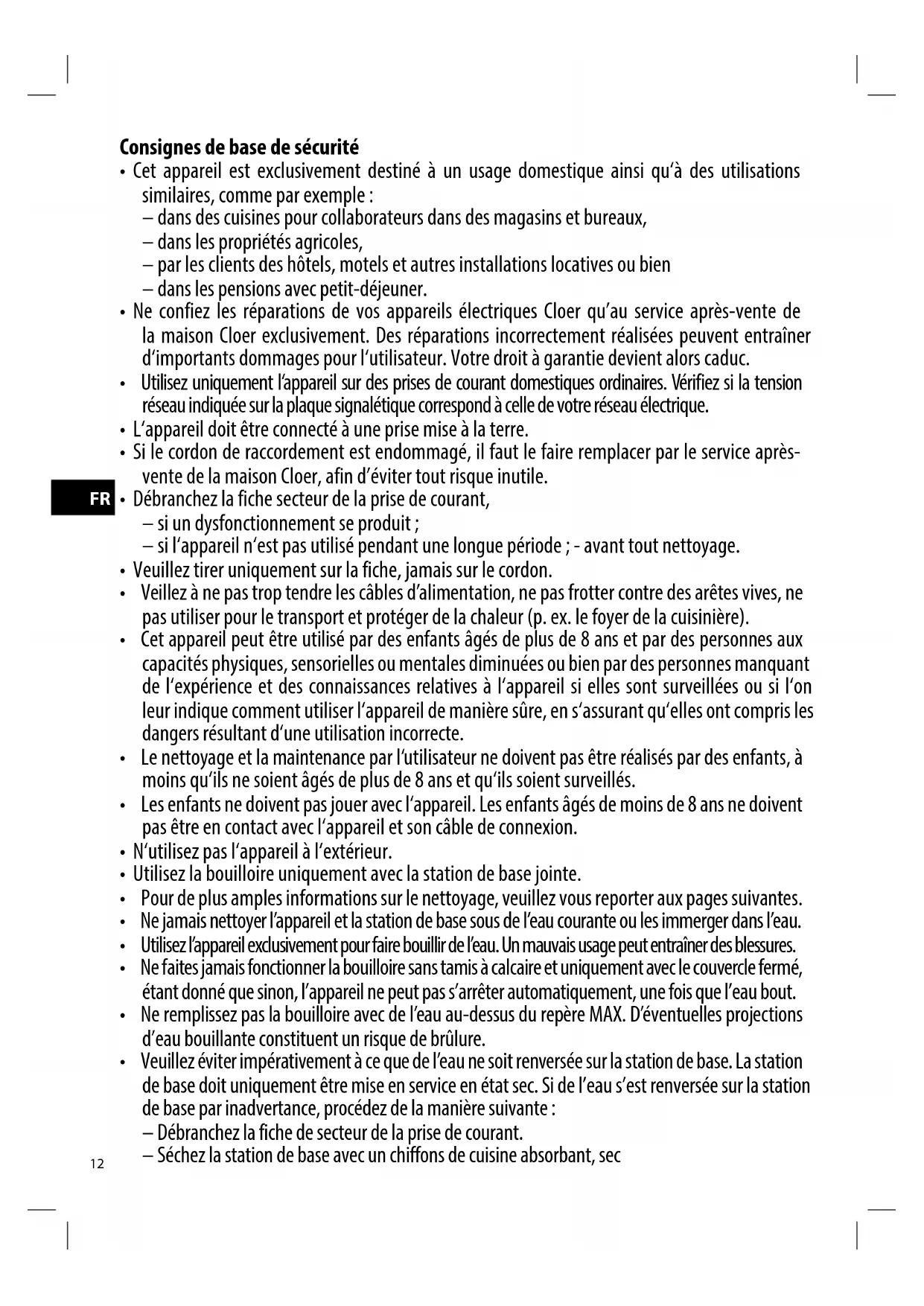 Les apparèils électriques correspondant aux directives actuelles et aux prescriptions en matière de sécurité de l'UE. Si vous appareil Cloer présente un dysfonctionnement, ou qu'il ne fonctionne pas correctement, veuilles consulter votre distributeur/agréé ou le service après-vente d'usine de Cloer.