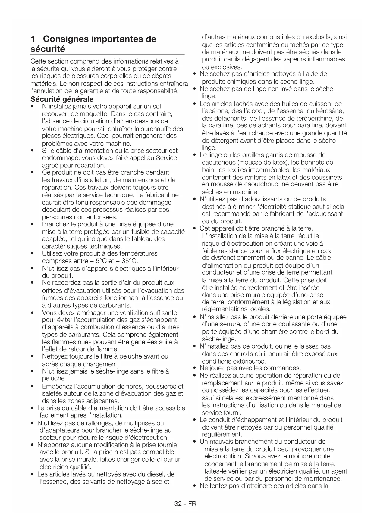 - Netentezpasd’atteindredesarticlesdansla 32-FRmachine si le tambour fonctionne.• Débranchezlamachinelorsquecelle-cin’estpasutilisée.• Nenettoyezjamaisl’appareilavecdel’eau!Vousvousexposeriezàunrisqued’électrocution!Avant de procéder au nettoyage, coupez toujours l’alimentation de la machine en la débranchant.• Netouchezjamaislapriseavecdesmainsmouillées. Ne débranchez jamais la machine en tirant sur le câble, saisissez uniquement la prise pour la débrancher. Ne faites pas fonctionner la machine si le câble d’alimentation ou la prise est endommagée!• N’essayezjamaisderéparerlamachinevous-même.Danslecascontraire,vousexposerezvotre vie ainsi que celle d’autres personnes• Pourlesdysfonctionnementsquinepeuventêtrerésolusàl’aidedesinformationsfourniesdanslesconsignes de sécurité : Eteignez la machine, débranchez-la, fermez le robinet d’arrivée d’eau et contactez un agent du service agrée.• N’arrêtezpaslesèche-lingeavantlafinducyclede séchage sauf si vous retirez tout le linge rapidement de la machine pour l’étendre et dissiper la chaleur.• Retirezlaporteducompartimentdeséchageavant de jeter ou de mettre au rebut le produit.•Ladernièrepartieducycledeséchageestréaliséesanschaleur(cyclederefroidissement)pourgarantirquelesarticlessontlaissésàunetempérature qui ne les endommagera pas.•Lesadoucissantsouproduitssimilairesdoiventêtreutilisésselonlesinstructionsfourniesavecl’adoucissant.•Lalingeriecontenantdesrenfortsmétalliquesnedoitpasêtreplacéedanslesèche-linge.Silesrenforts métalliques se détachent pendant le séchage, cela peut endommager le sèche-linge.•Vérifiezlelingepourvousassurerquetousleséléments (briquets, pièces de monnaie, objets, aiguilles,etc)oubliésontétéretirésavantdelecharger dans la machine.•Parfois,lorsquevotresèche-lingen’estpasencours d’utilisation ou après avoir sorti le linge àlafinduprocessusdeséchage,éteignezlamachineenmettantleboutonMarche/ArrêtàlapositionOff».LorsqueleboutonMarche/ArrêtsetrouveàlapositionON(lorsquelesèche-lingeestsous-tension),maintenezlaportedusèche-lingefermée. Utilisation prévue