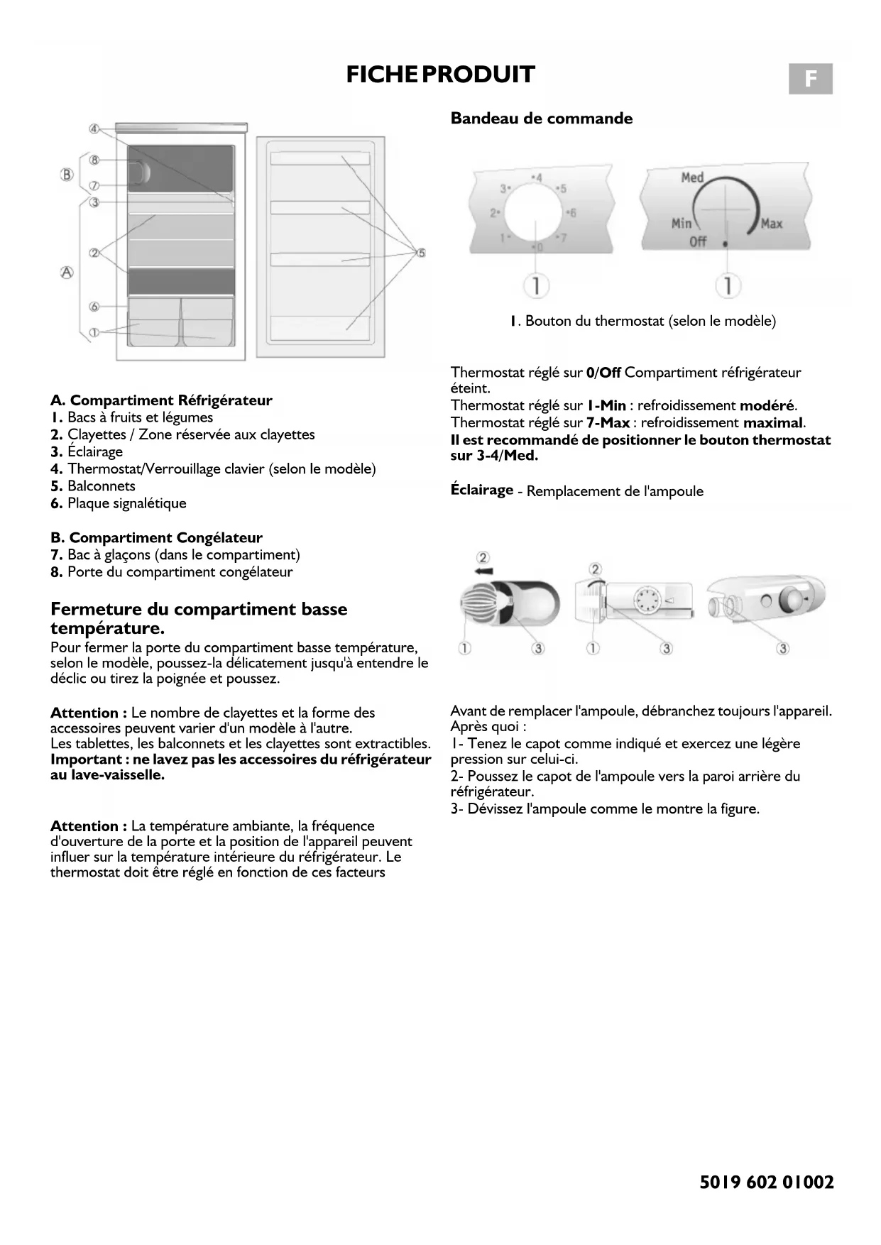 5019 602 01002 A. Compartiment Réfrigérateur 1. Bacs à fruits et légumes 2. Clayettes / Zone réservée aux clayettes 3. Éclairage 4. Thermostat/Verrouillage clavier (selon le modèle) 5. Balconnets 6. Plaque signalétique
