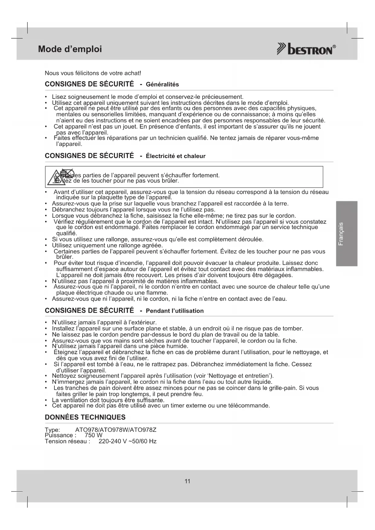 ATO978 - Grille pain BESTRON - Notice d'utilisation et mode d'emploi gratuit
