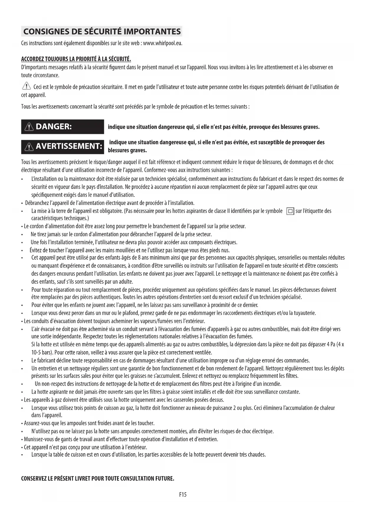 Ces instructions sont également disponibles sur le site web : www.whirlpool.eu. ACCORDEZ TOUJOURS LA PRIORITÉ À LA SÉCURITÉ. D’importants messages relatifs à la sécurité gurent dans le présent manuel et sur l’appareil. Nous vous invitons à les lire attentivement et à les observer en toute circonstance. Ceci est le symbole de précaution sécuritaire. Il met en garde l’utilisateur et toute autre personne contre les risques potentiels dérivant de l’utilisation de cet appareil. Tous les avertissements concernant la sécurité sont précédés par le symbole de précaution et les termes suivants : indique une situation dangereuse qui, si elle n’est pas évitée, provoque des blessures graves. indique une situation dangereuse qui, si elle n’est pas évitée, est susceptible de provoquer des blessures graves. Tous les avertissements précisent le risque/danger auquel il est fait référence et indiquent comment réduire le risque de blessures, de dommages et de choc électrique résultant d’une utilisation incorrecte de l’appareil. Conformez-vous aux instructions suivantes :