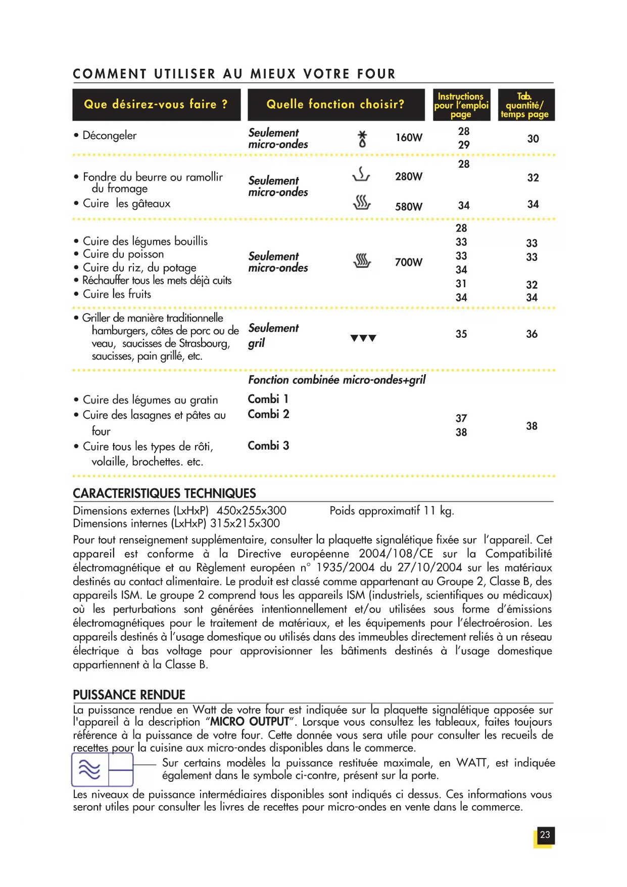 - Cuire tous les types de rôti, volaille, brochettes. etc. Dimensions externes (LxHxP) 450x255x300 Dimensions internes (LxHxP) 315x215x300 Poids approximatif 11 kg. Pour tout renseignement supplémentaire, consulter la plaquette signalétique fixée sur l’appareil. Cet appareil est conforme à la Directive européenne 2004/108/CE sur la Compatibilité électromagnétique et au Règlement européen n° 1935/2004 du 27/10/2004 sur les matériaux destinés au contact alimentaire. Le produit est classé comme appartenant au Groupe 2, Classe B, des appareils ISM. Le groupe 2 comprend tous les appareils ISM (industriels, scientifiques ou médicaux) où les perturbations sont générées intentionnellement et/ou utilisées sous forme d’émissions électromagnétiques pour le traitement de matériaux, et les équipements pour l’électroérosion. Les appareils destinés à l’usage domestique ou utilisés dans des immeubles directement reliés à un réseau électrique à bas voltage pour approvisionner les bâtiments destinés à l’usage domestique appartiennent à la Classe B. PUISSANCE RENDUE La puissance rendue en Watt de votre four est indiquée sur la plaquette signalétique apposée sur l'appareil à la description “MICRO OUTPUT”. Lorsque vous consultez les tableaux, faites toujours référence à la puissance de votre four. Cette donnée vous sera utile pour consulter les recueils de recettes pour la cuisine aux micro-ondes disponibles dans le commerce. Sur certains modèles la puissance restituée maximale, en WATT, est indiquée également dans le symbole ci-contre, présent sur la porte. Les niveaux de puissance intermédiaires disponibles sont indiqués ci dessus. Ces informations vous seront utiles pour consulter les livres de recettes pour micro-ondes en vente dans le commerce. Seulement micro-ondes 160W Seulement micro-ondes 280W 580W Seulement micro-ondes 700W Seulement gril MMM Combi 1 Combi 2 Combi 3 Fonction combinée micro-ondes+gril