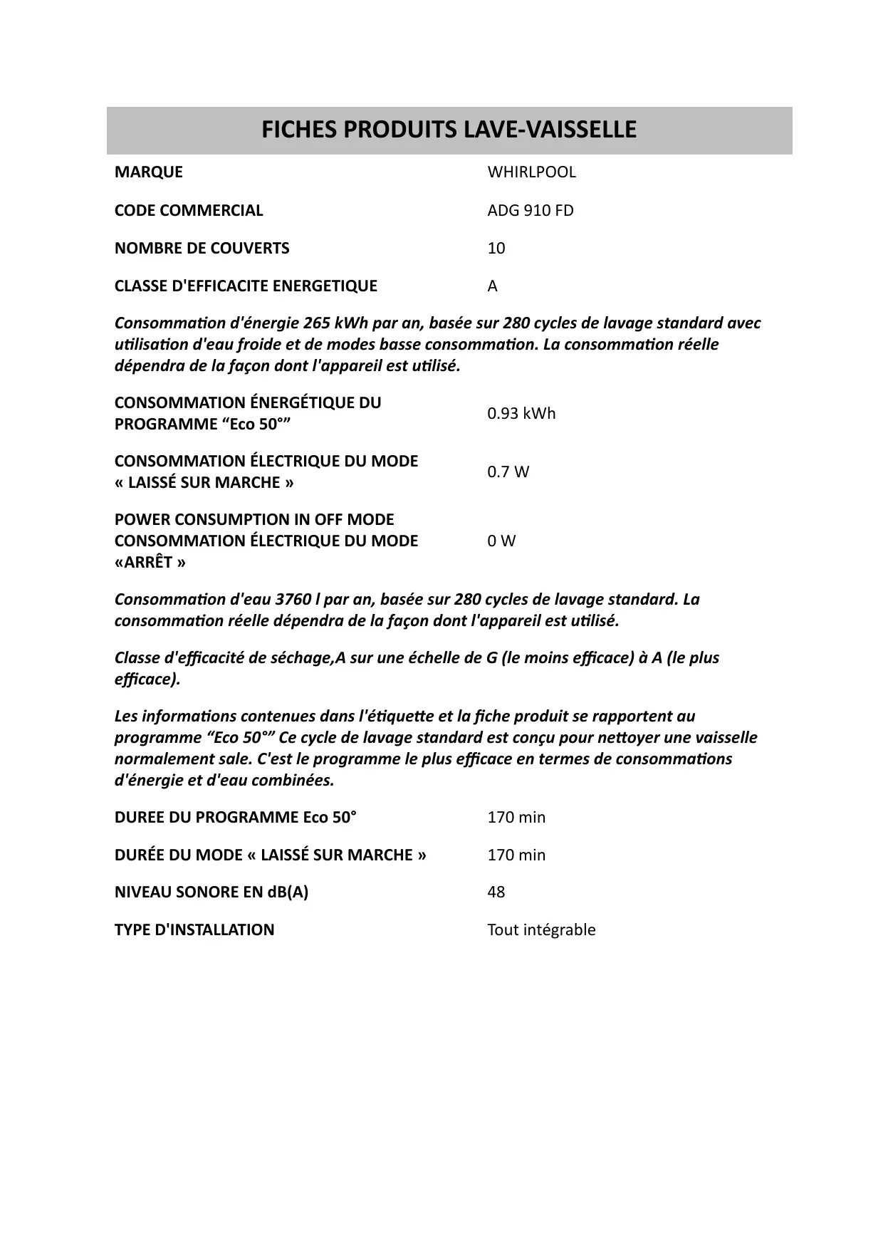 ADG 910 FD - FICHE PRODUIT - Lave-vaisselle WHIRLPOOL - Notice d'utilisation et mode d'emploi gratuit