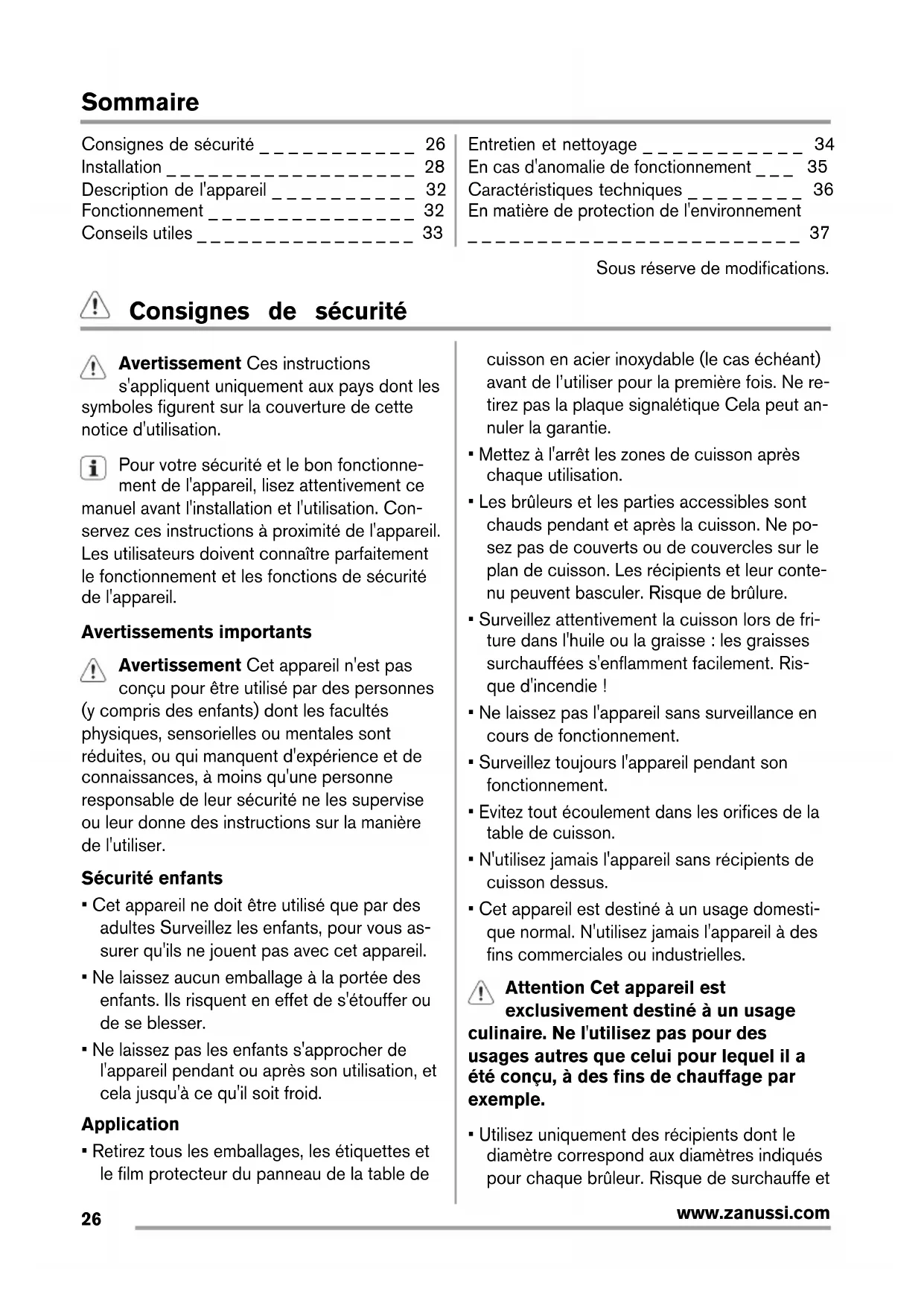 Consignes de sécurité _ _ _ _ _ _ _ _ _ _ _ 26