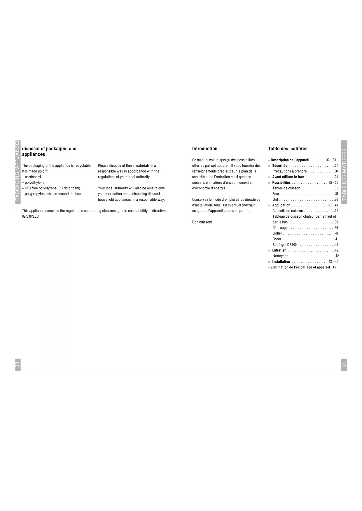 - Introduction Ce manuel est un aperçu des possibilités offertes par cet appareil. Il vous fournira des renseignements précieux sur le plan de la sécurité et de l'entretien ainsi que des conseils en matière d'environnement et d'économie d'énergie. Conservez le mode d'emploi et les directives d'installation. Ainsi, un éventuel prochain usager de l'appareil pourra en profiter. Bon cuisson! Table des matières ■ Description de l’appareil p. 32
