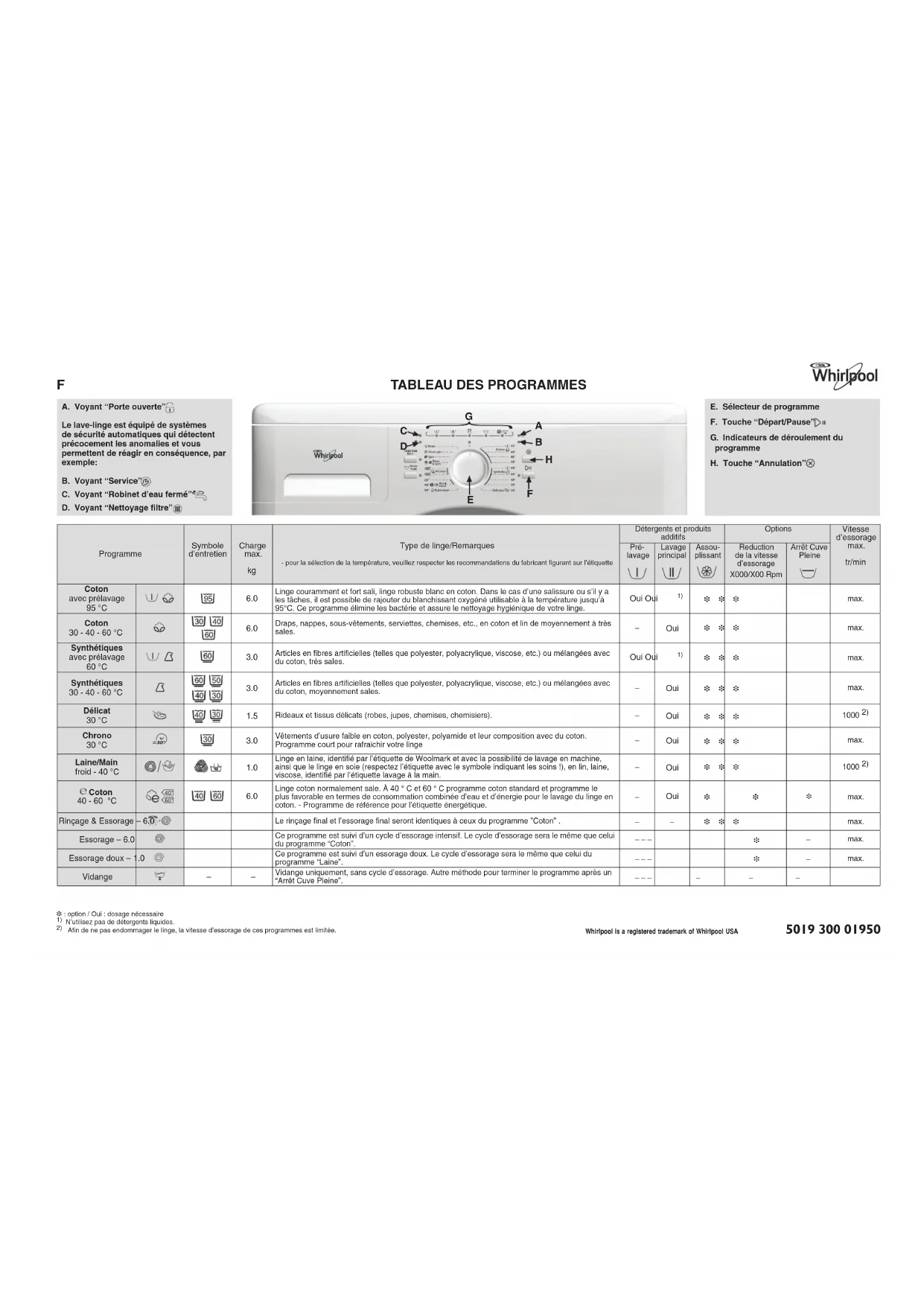 Whirlpool is a registered trademark of Whirlpool USA 5019 300 01950VERSEZ LE DÉTERGENT, FERMEZ LE HUBLOT ET SÉLECTIONNEZ LE PROGRAMME Versez le détergent conformément aux