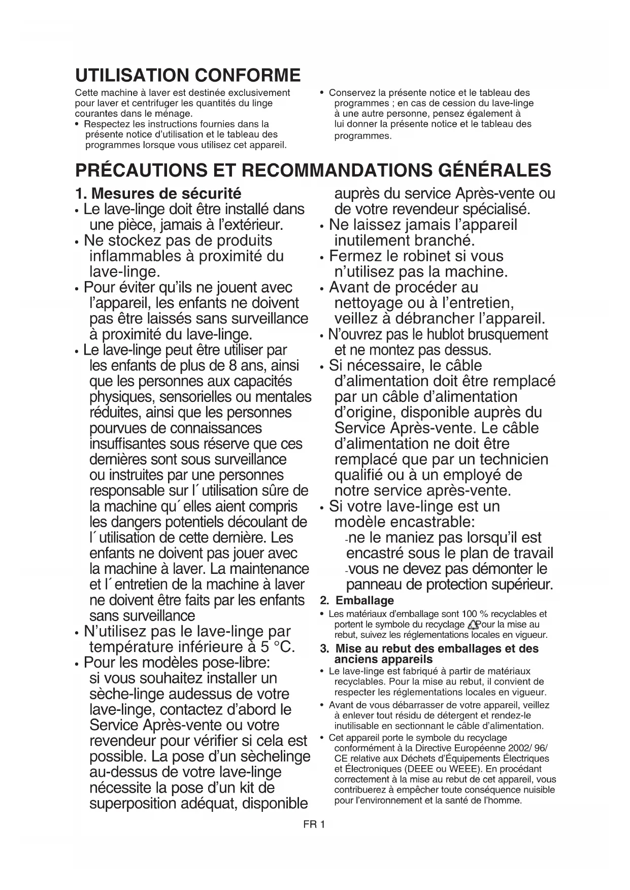 UTILISATION CONFORME Cette machine à laver est destinée exclusivement