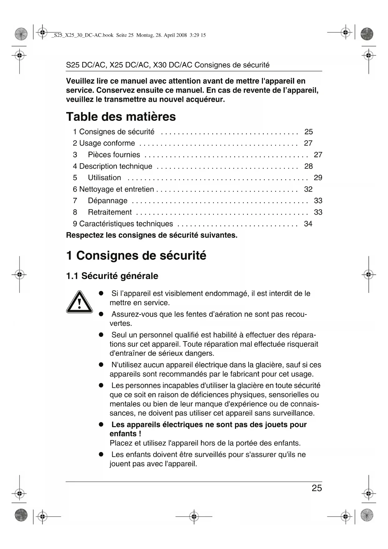 z Si l’appareil est visiblement endommagé, il est interdit de le mettre en service. z Assurez-vous que les fentes d’aération ne sont pas recou- vertes. z Seul un personnel qualifié est habilité à effectuer des répara- tions sur cet appareil. Toute réparation mal effectuée risquerait d'entraîner de sérieux dangers. z N'utilisez aucun appareil électrique dans la glacière, sauf si ces appareils sont recommandés par le fabricant pour cet usage. z Les personnes incapables d'utiliser la glacière en toute sécurité que ce soit en raison de déficiences physiques, sensorielles ou mentales ou bien de leur manque d'expérience ou de connais- sances, ne doivent pas utiliser cet appareil sans surveillance. z Les appareils électriques ne sont pas des jouets pour enfants ! Placez et utilisez l'appareil hors de la portée des enfants. z Les enfants doivent être surveillés pour s'assurer qu'ils ne jouent pas avec l'appareil. _S25_X25_30_DC-AC.book Seite 25 Montag, 28. April 2008 3:29 15Consignes de sécurité S25 DC/AC, X25 DC/AC, X30 DC/AC