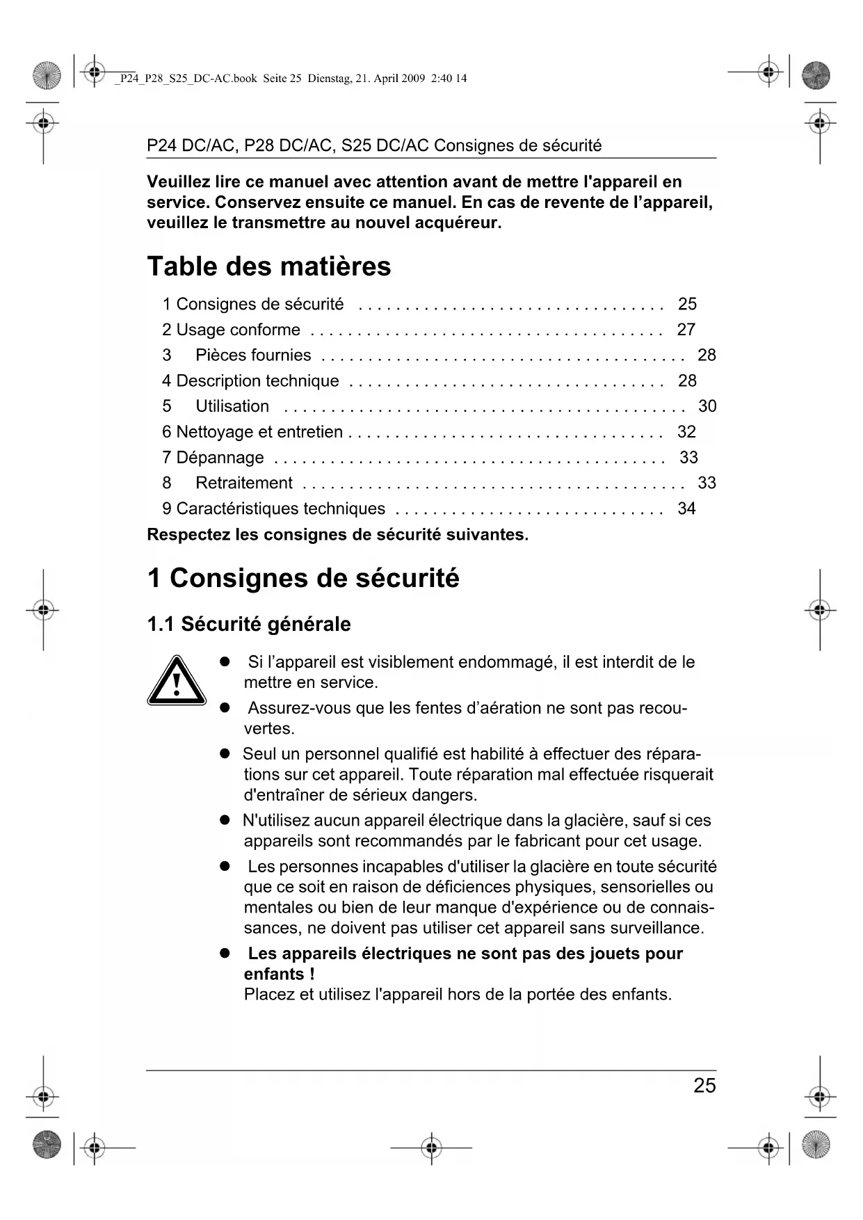 _P24_P28_S25_DC-AC.book Seite 25 Dienstag, 21. April 2009 2:40 14Consignes de sécurité P24 DC/AC, P28 DC/AC, S25 DC/AC