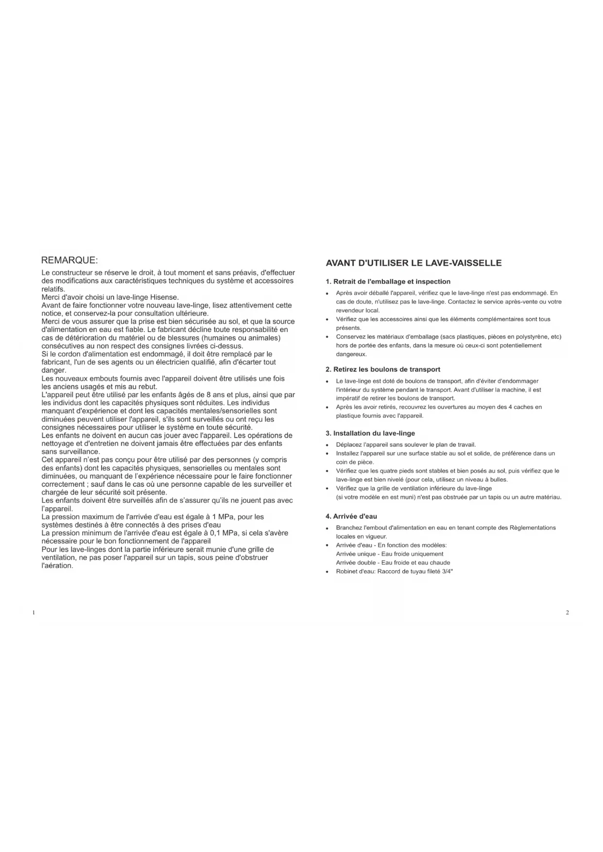 Avant de faire fonctionner votre nouveau lave-linge, lisez attentivement cette