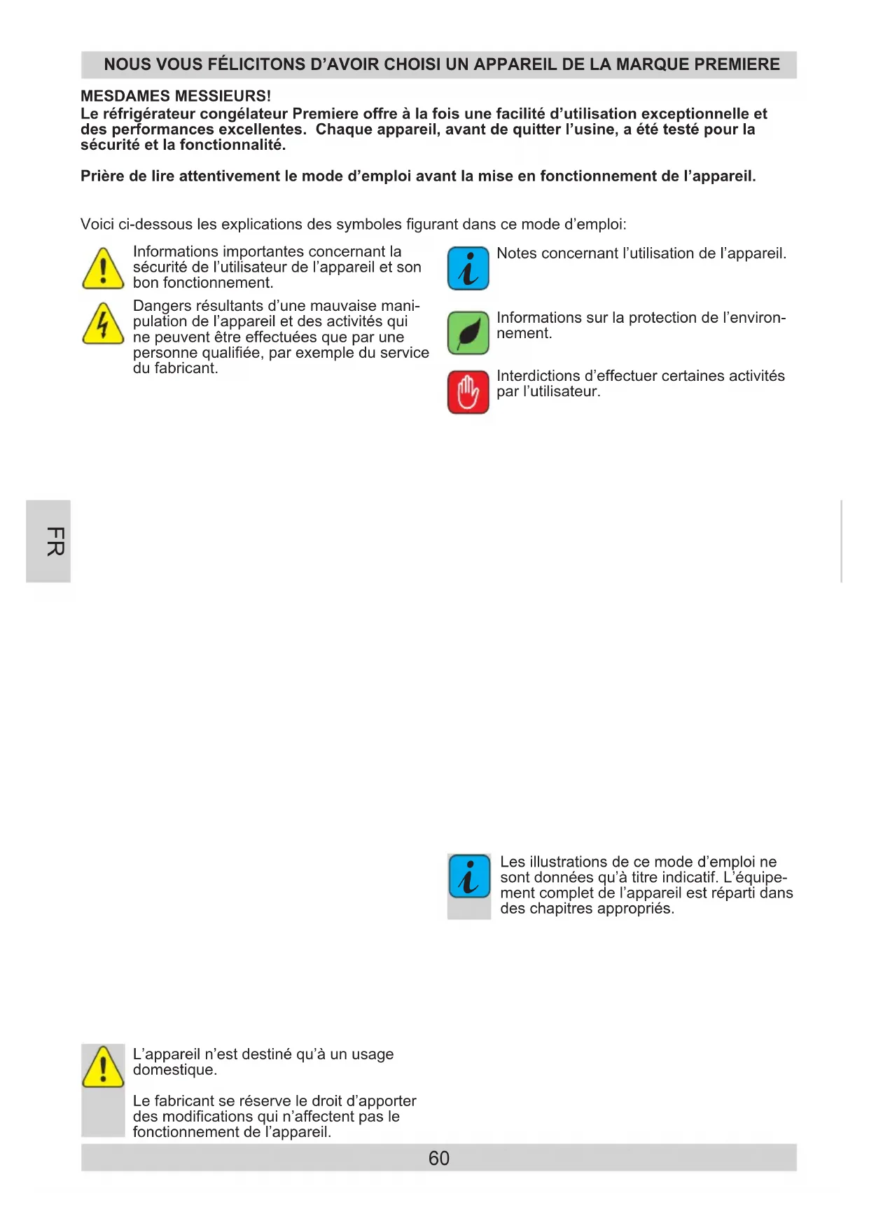 NOUSVOUSFÉLICITONSD’AVOIRCHOISIUNAPPAREILDELAMARQUEPREMIERE Voici ci-dessous les explications des symboles gurant dans ce mode d’emploi: