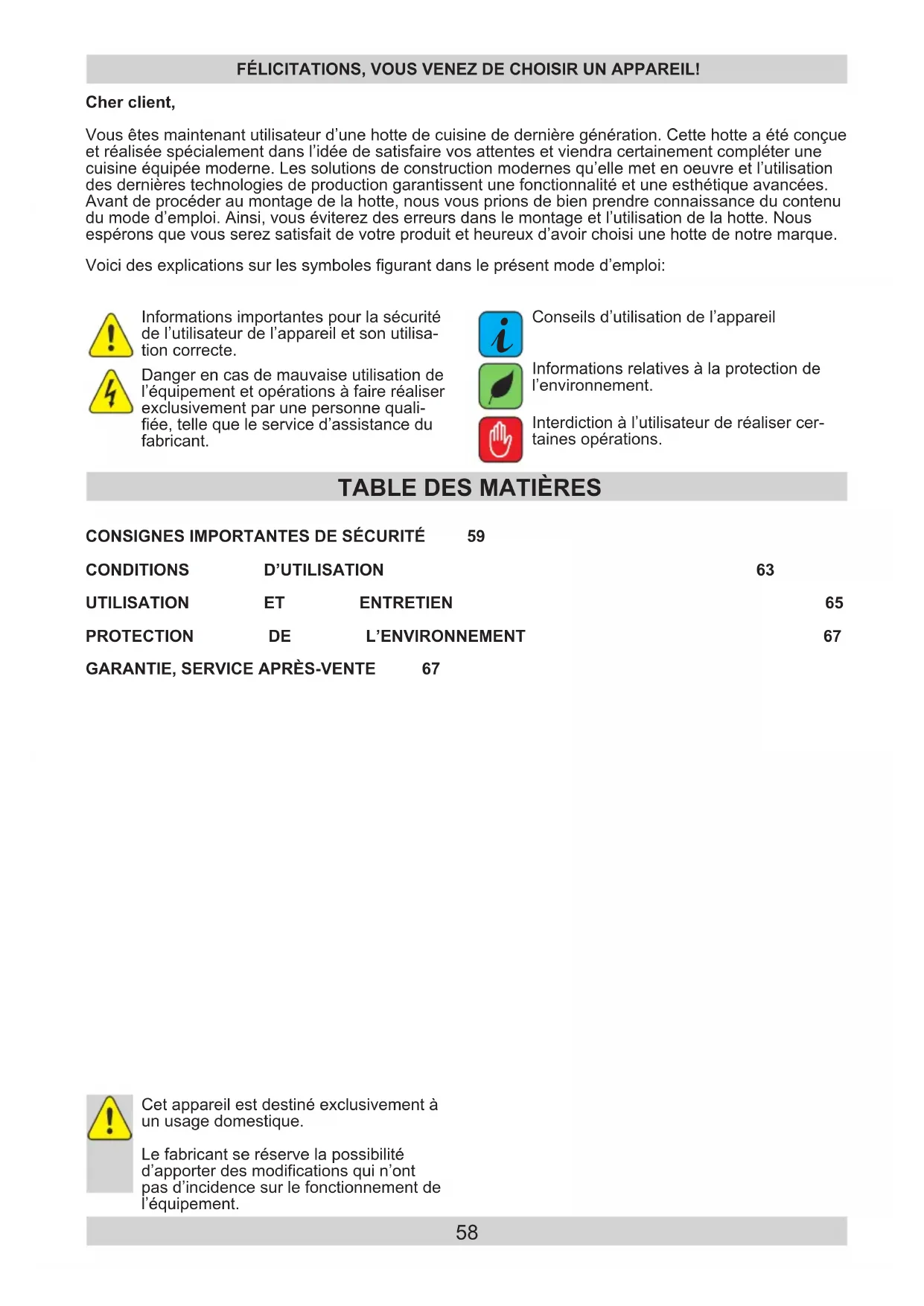NOTICE D’UTILISATION – HOTTE ASPIRANTE FR 58