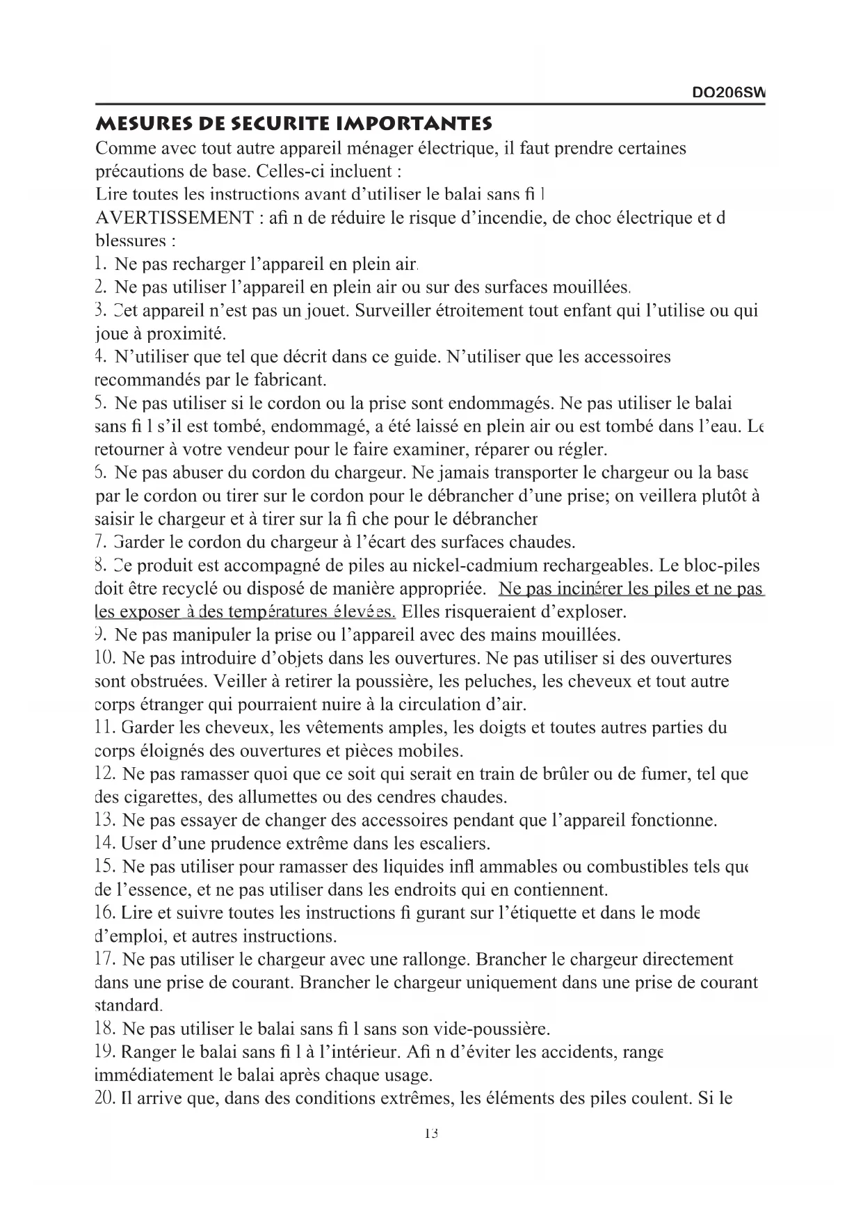 12DO206SW MESURES DE SECURITE IMPORTANTES Comme avec tout autre appareil ménager électrique, il faut prendre certaines