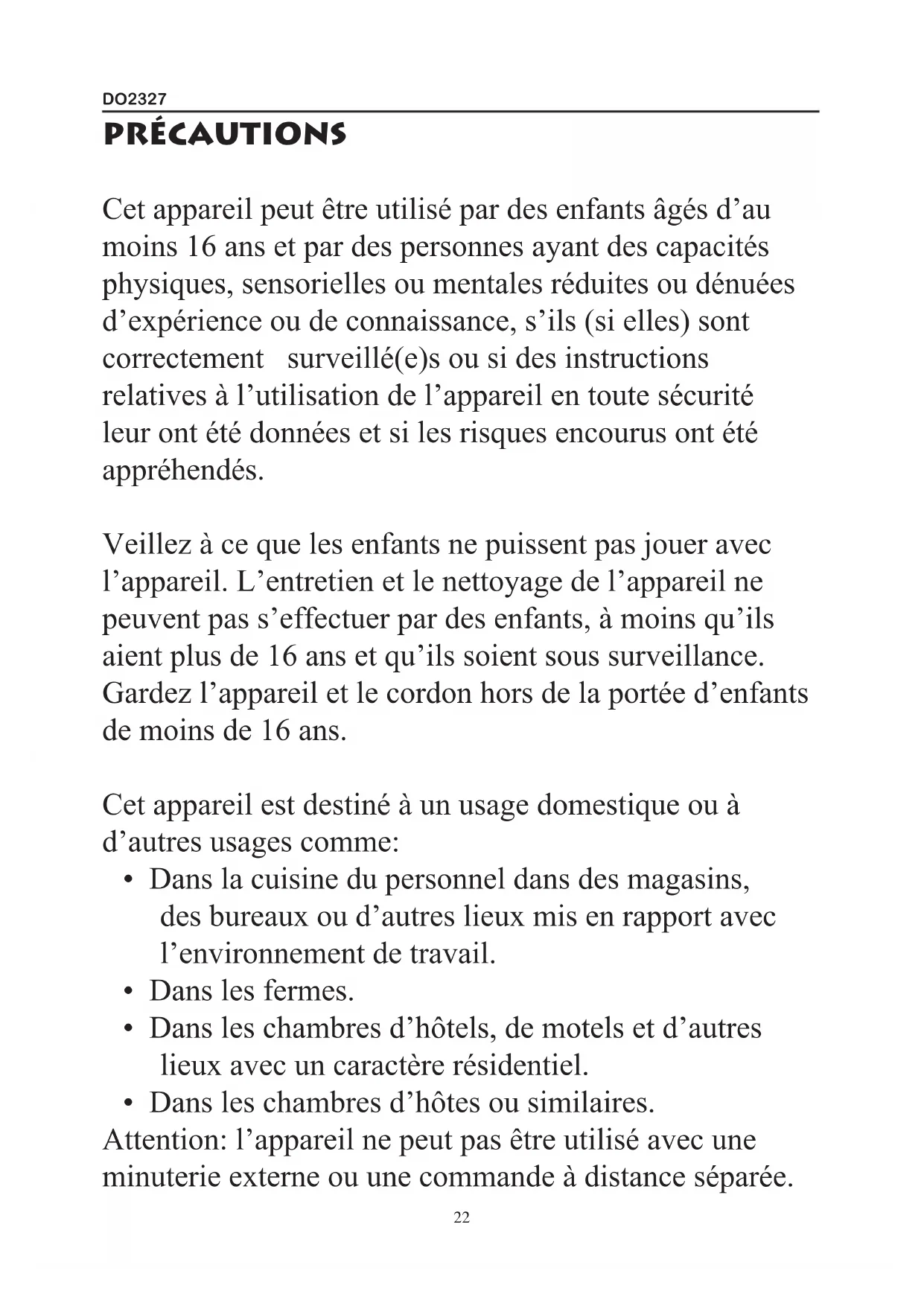 - Dans les chambres d’hôtes ou similaires. Attention: l’appareil ne peut pas être utilisé avec une minuterie externe ou une commande à distance séparée.DO2327