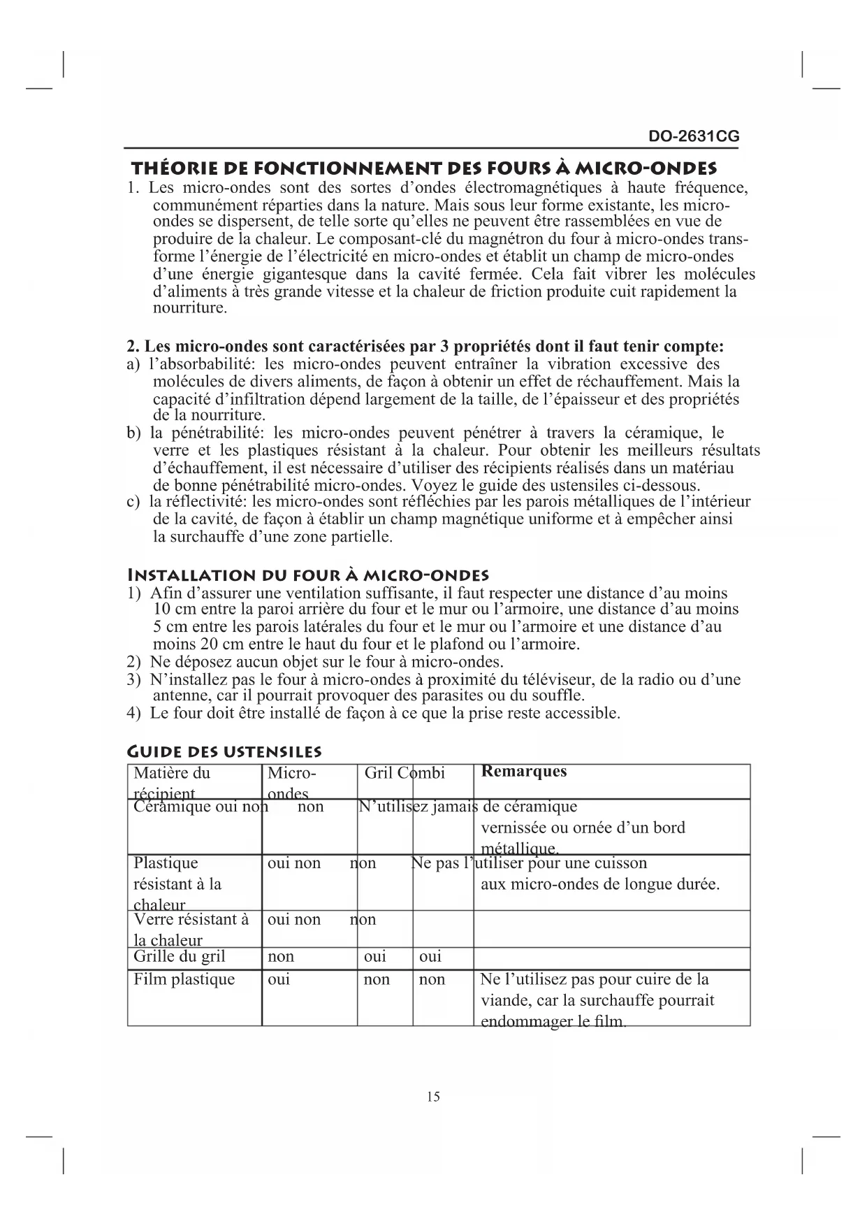 Guide des ustensiles Matière du récipient Micro- ondes Gril Combi Remarques Céramique oui non non N’utilisez jamais de céramique vernissée ou ornée d’un bord métallique. Plastique résistant à la chaleur oui non non Ne pas l’utiliser pour une cuisson aux micro-ondes de longue durée. Verre résistant à la chaleur oui non non Grille du gril non oui oui Film plastique oui non non Ne l’utilisez pas pour cuire de la viande, car la surchauffe pourrait endommager le film.DO-2631CG