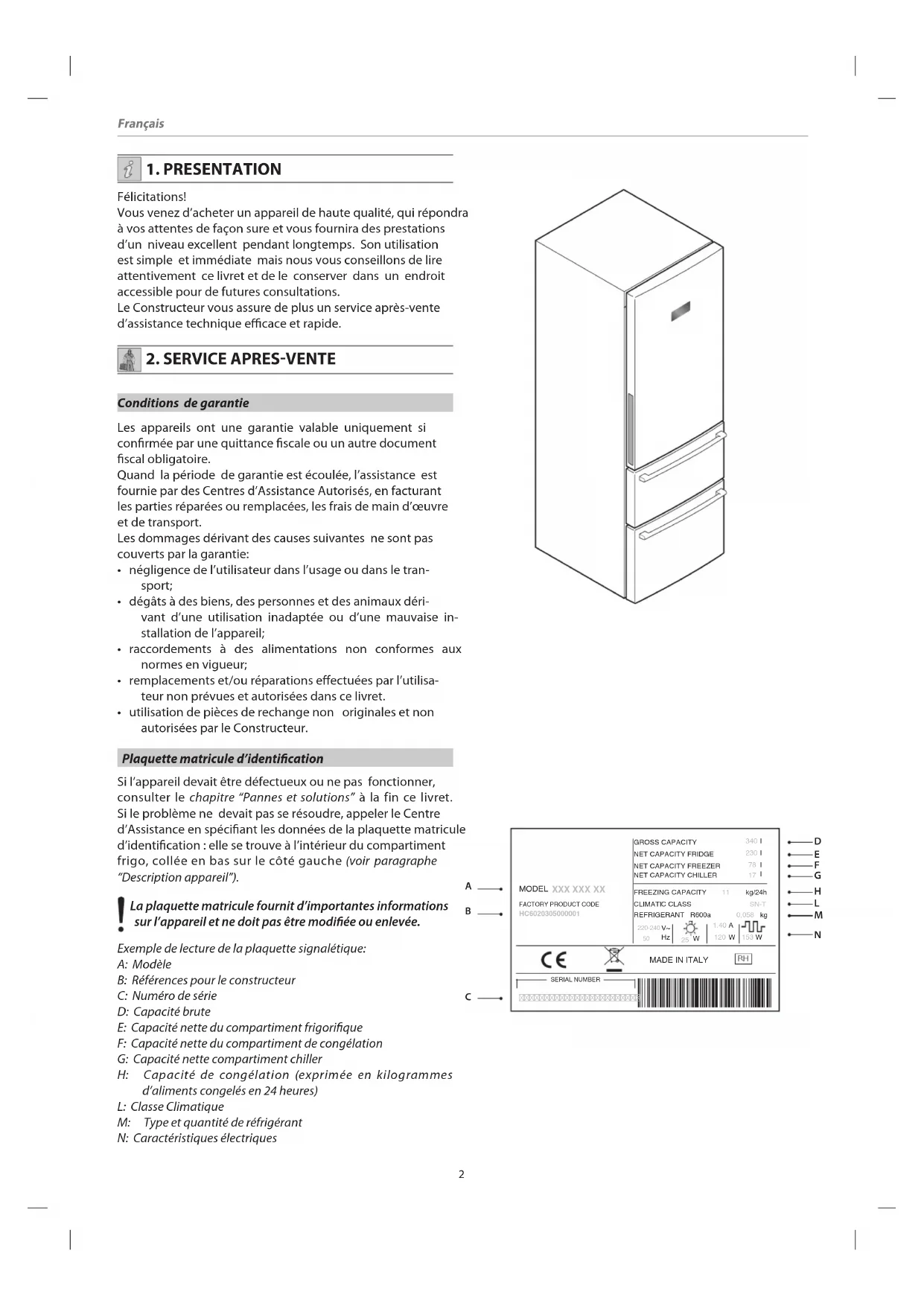 Débrancher l’alimentation électrique avant toute opération.Nettoyage interneNettoyer toutes les parties internes à l’eau tiède et au savon neutre, au vinaigre ou au bicarbonate de soude, sécher ensuite soigneusement. En alternative, utiliser des détergents spéciques pour le frigidaire en vente dans les supermarchés.Ne pas utiliser de détergents et/ou poudresabrasives, à base de soude, ou des solvants car ilspourraientabîmerlesnitions.Pourfaciliterlenettoyage, il est possible d’enlever les accessoires internes (consulter le paragraphe “Démontage composants”).Nettoyage externeNettoyer toutes les parties externes avec des détergents spécifiques, ne pas utiliser de détergents et/ou poudresabrasives, à base de soude, des solvants qui pourraient abîmer les nitions ou des jets d’eau.Démontage des composantsPourfaciliterlesopérations denettoyage,ilestpossiblededémonter tous les composants internes de l’appareil. Suivre les indications de la gure relative. A: Tiroir freezer, tiroir fruits/légumes “Fresh Control 0°C”: ces tiroirs coulissent sur des guides particuliers dotés d’arrêts qui empêchent que, en ouvrant les tiroirs, ils ne sortent totalement et ne risquent de tomber par terre. Si l’on souhaite les enlever de l’appareil pour les opérations de nettoyage, les extraire jusqu’au 3/4, les soulever légèrement vers le haut et continuer l’extraction en les maintenant inclinés vers le haut.B: Compartiments dans le porte: ils sont simplement enlés sur des guides intégrés à la porte, pour les extraire, les soulever vers le haut en poussant de façon ferme par le bas. C: Tiroirs freezer: il n’est pas possible de les enlever complètement de l’appareil pour des raisons de sécurité; une fois ouverts jusqu’à l’extraction maximale consentie å, il est possible d’extraire les tiroirs internes en les soulevant simplement vers le haut ç.D: Plan en verre en deux parties: le plan antérieur (D2) est accroché à celui postérieur pour en empêcher la sortie accidentelle (voir part.ç); pour l’extraire, soulever légèrement le plan postérieur (D1) et faire glisser le plan antérieur (D2Le plan postérieur (D1) est bloqué à son extrémité par deux crochets qui en empêchent la sortie accidentelle (voir part.é), pour l’extraire, soulever vers le haut et le tirer vers soi jusqu’à l’enlever. Quand on replace les deux plans (D1 et D2), s’assurer de les accrocher à nouveau l’un à l’autre. E: Plan en verre avec porte-bouteilles: le plan glisse sur des guides et a deux crochets qui en empêchent la sortie accidentelle (voir part.å); si l’on souhaite l’enlever de l’appareil pour les opérations de nettoyage, le soulever légèrement vers le haut et l’extraire en continuant à le tenir incliné vers le haut. F: Plan en verre: le plan coulisse sur des guides, si l’on désire l’enlever de l’appareil pour les opérations de nettoyage, enlever le tiroir “Fresh Control 0°C”, soulever légèrement le plan vers le haut et l’extraire en continuant à le tenir incliné vers le haut.