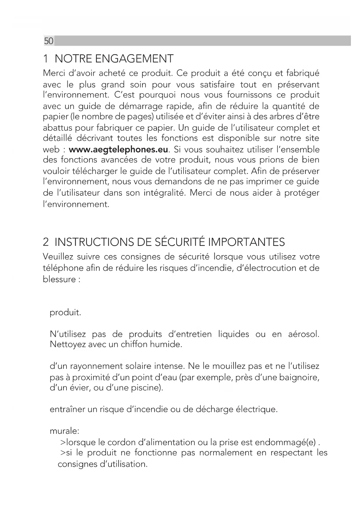 Ce produit est conforme aux prescriptions essentielles et aux autres dispositions pertinentes de la directive 1999/5/EC de la R&TTE. La déclaration de conformité est disponible à l’adresse suivante : www.aegtelephones.eu 17 MISE AU REBUT DE L‘APPAREIL (RESPECT DE L‘ENVIRONNEMENT) Lorsque l’appareil est hors d’usage, ne le jetez pas dans les ordures ménagères mais apportez-le à un point de collecte où ses composants électriques et électroniques pourront être recyclés. Ceci est indiqué par le symbole figurant sur le produit, dans le mode d’emploi ou sur l‘emballage. Certains matériaux de l’appareil sont réutilisables si vous l‘apportez à un centre de recyclage. En permettant la réutilisation de certaines pièces ou matières premières d’appareils hors d’usage, vous contribuez de façon importante à la protection de l‘environnement. Veuillez vous adresser aux autorités locales pour plus d‘informations concernant les points de collecte de votre région. Les piles doivent être retirées avant la mise au rebut de l‘appareil. Éliminez les piles en respectant l’environnement et la réglementation de votre pays.1 ONZE ZORG Wij willen u bedanken voor de aankoop van dit product. Bij de ontwikkeling en montage van dit product stonden u en het milieu centraal. Daarom krijgt u bij dit product een verkorte installatiehandleiding, zodat er minder papier wordt gebruikt en er dus minder bomen moeten worden gekapt. Een volledige, gedetailleerde gebruikershandleiding met beschrijvingen van alle functies vindt u op onze website www.aegtelephones.eu. Hier kunt u de gebruikershandleiding integraal downloaden zodat u alle geavanceerde functies van uw product kunt gebruiken. Met het oog op het milieu zouden wij u evenwel willen verzoeken om de volledige handleiding niet af te drukken. Bedankt dat u ons steunt in onze zorg voor het milieu. 2 BELANGRIJKE VEILIGEIDSINSTRUCTIES Volg deze veiligheidsvoorschriften wanneer u uw telefoonapparatuur gebruikt om het risico van brand, elektrische schokken of lichamelijk letsel te verminderen: