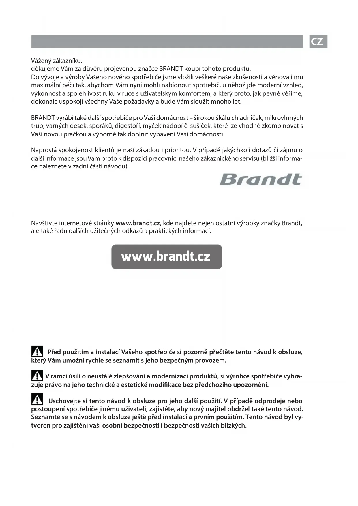 Cette touche vous permet de réduire ou d’augmen- ter la durée du cycle de lavage selon 2 niveaux accessibles par appuis successifs.— Le niveau 1 (led de gauche) correspondant à du linge sale, augmente en moyenne la durée du cycle de 15% (Fig. 3.2.3) — Le niveau 2 (led de droite) correspondant à du linge à rafraichir, diminue en moyenne la durée du cycle de 40% (Fig. 3.2.4) PROGRAMMES POUR LES ESSAIS SELON RÉGLEMENT DÉLÉGUÉ (UE) N°1061/2010 - Programme coton standard à 60°C : Coton ECO - - sans option - essorage maxi. 60°c60°c - Programme coton standard à 40°C : Coton ECO - - sans option - essorage maxi. 40°c40°c Tableau de programmes Programmes Température (°C) Charge maximale de linge sec Durée du cycle (*) Degré de salissure Peaux sensibles RepassagefacileÉgouttageArrêt cuvepleine COTON / ÉPONGE Froid - 90 5,5 kg 1h50 - 2h10 COTON ECO 40 - 60 5,5 kg 2h20 - 3h20 COTON + PRÉLAVAGE Froid - 40 5,5 kg 2h00 - 3h00 MIXTE - Synthétique - Fibres mélangées Froid - 60 2,5 kg 1h20 Programmes spéciaux OptiA 39 minutes Froid - 40 3,0 kg 39 min Flash 25 minutes Froid - 40 2,5 kg 25 min Berce-laine Froid - 30 1,0 kg 32 min Chemises Froid - 40 1,5 kg 38 min Programmes particuliers Rinçage / Essorage - - 19 min18 OPRAVYVeškeré opravy Vašeho přístroje smí provádět výhradně kvalikovaný personál autorizovaného servisu dovozce. Kontaktujete-li zákaznickou linku centrálního servisu, uveďte operátorce kom-pletní údaje o Vašem spotřebiči (model, typ, sériové číslo), které najdete na jeho výrobním štítku (obr. 1.1.1).ORIGINÁLNÍ NÁHRADNÍ DÍLYPři servisních zásazích požadujte výhradně užití originálních náhradních dílů s certikátem zaručujícím jejich původ. INTERVENTIONS FRANCE (ATTENTE REPONSE B.MARONNE) Les éventuelles interventions sur votre appareil doivent être effectuées par un professionnel qualifié dépositaire de la marque. Lors de votre appel, afin de faciliter la prise en charge de votre demande, munissez-vous des réfé- rences complètes de votre appareil (référence commerciale, référence service, numéro de série). Ces rensei- gnements figurent sur la plaque signalétique (Fig.1.1.1). Vous pouvez nous contacter du lundi au samedi de 8h00 à 20h00 au : Pièces d’origine : Lors d’une intervention, demandez l’utilisation exclusive de pièces détachées certifiées d’origine. RELATIONS CONSOMMATEURS FRANCE(ATTENTE REPONSE B.MARONNE) NOTES Service fourni par Brandt France, S.A.S au capital social de 100.000.000 euros RCS Nanterre 801 250 531 Pour en savoir plus sur nos produits ou nous contacter, vous pouvez : consulter notre site : nous écrire à l’adresse postale suivante : Service Consommateurs BRANDT 5 avenue des Béthunes