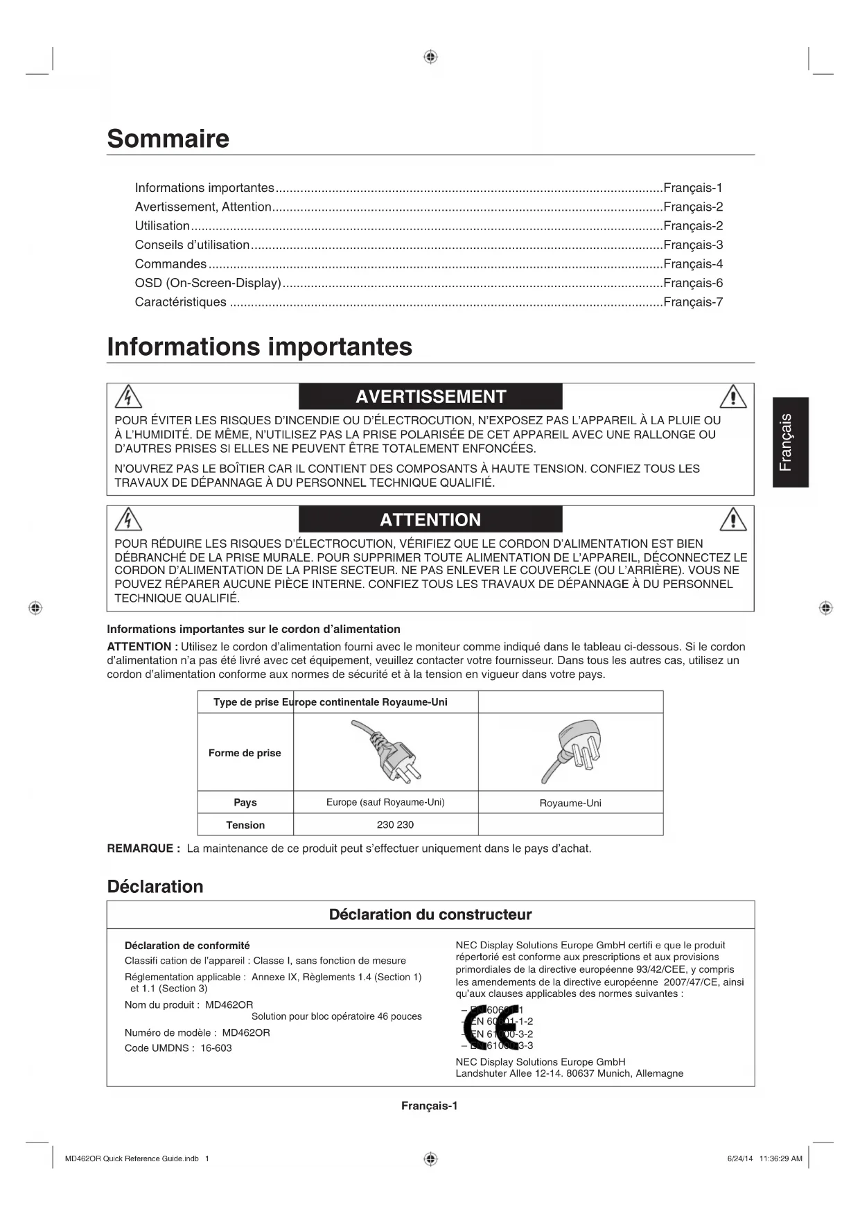 Dimensiones 1055,4 (W) x 608,6 (H) x 69,3 (D) mm / 41,6 (W) x 24,0 (H) x 2,7 (D) pulgadas (con asa) 1055,4 (W) x 608,6 (H) x 64,5 (D) mm / 41,6 (W) x 24,0 (H) x 2,5 (D) pulgadas (sin asa) Peso 21,4 kg (47,2 libras) Interfaz de montaje compatible con VESA 300 mm x 300 mm (M6, 4 orifi cios) Gestión de alimentación VESA DPM Plug & Play VESA DDC2B, DDC/CI, DisplayPort Suministro de alimentación para la Ranura 2 tipo OPTION 16V/3,6 A Accesorios Manual de confi guración, cable de alimentación, cable de señal de vídeo, mando a distancia, 2 pilas AAA, 1 abrazadera, 1 tornillo, CD-ROM NOTA: Reservado el derecho a modifi car las especifi caciones técnicas sin previo aviso. *1: Imagen comprimida. *2: Terminal común. *3: Si utiliza accesorios para la placa opcional, póngase en contacto con el proveedor para obtener información detallada. *4: El texto mostrado puede aparecer borroso. MD462OR Quick Reference Guide.indb 7MD462OR Quick Reference Guide.indb 7 6/24/14 11:36:28 AM6/24/14 11:36:28 AMEspañol-8 MD462OR Quick Reference Guide.indb 8MD462OR Quick Reference Guide.indb 8 6/24/14 11:36:29 AM6/24/14 11:36:29 AMFrançais-1 Français Sommaire Informations importantes ..............................................................................................................Français-1 Avertissement, Attention ...............................................................................................................Français-2 Utilisation ......................................................................................................................................Français-2 Conseils d’utilisation .....................................................................................................................Français-3 Commandes .................................................................................................................................Français-4 OSD (On-Screen-Display) ............................................................................................................Français-6 Caractéristiques ...........................................................................................................................Français-7 Informations importantes POUR ÉVITER LES RISQUES D’INCENDIE OU D’ÉLECTROCUTION, N’EXPOSEZ PAS L’APPAREIL À LA PLUIE OU À L’HUMIDITÉ. DE MÊME, N’UTILISEZ PAS LA PRISE POLARISÉE DE CET APPAREIL AVEC UNE RALLONGE OU D’AUTRES PRISES SI ELLES NE PEUVENT ÊTRE TOTALEMENT ENFONCÉES. N’OUVREZ PAS LE BOÎTIER CAR IL CONTIENT DES COMPOSANTS À HAUTE TENSION. CONFIEZ TOUS LES TRAVAUX DE DÉPANNAGE À DU PERSONNEL TECHNIQUE QUALIFIÉ. AVERTISSEMENT POUR RÉDUIRE LES RISQUES D’ÉLECTROCUTION, VÉRIFIEZ QUE LE CORDON D’ALIMENTATION EST BIEN DÉBRANCHÉ DE LA PRISE MURALE. POUR SUPPRIMER TOUTE ALIMENTATION DE L’APPAREIL, DÉCONNECTEZ LE CORDON D’ALIMENTATION DE LA PRISE SECTEUR. NE PAS ENLEVER LE COUVERCLE (OU L’ARRIÈRE). VOUS NE POUVEZ RÉPARER AUCUNE PIÈCE INTERNE. CONFIEZ TOUS LES TRAVAUX DE DÉPANNAGE À DU PERSONNEL TECHNIQUE QUALIFIÉ. ATTENTION Informations importantes sur le cordon d’alimentation ATTENTION : Utilisez le cordon d’alimentation fourni avec le moniteur comme indiqué dans le tableau ci-dessous. Si le cordon d’alimentation n’a pas été livré avec cet équipement, veuillez contacter votre fournisseur. Dans tous les autres cas, utilisez un cordon d’alimentation conforme aux normes de sécurité et à la tension en vigueur dans votre pays. Type de prise Europe continentale Royaume-UniForme de prise Pays Europe (sauf Royaume-Uni)Royaume-UniTension230 230 REMARQUE : La maintenance de ce produit peut s’effectuer uniquement dans le pays d’achat. Déclaration Déclaration du constructeur Déclaration du constructeur Déclaration de conformitéClassifi cation de l’appareil : Classe I, sans fonction de mesureRéglementation applicable : Annexe IX, Règlements 1.4 (Section 1) et 1.1 (Section 3)Nom du produit : MD462OR Solution pour bloc opératoire 46 poucesNuméro de modèle : MD462ORCode UMDNS : 16-603NEC Display Solutions Europe GmbH certifi e que le produit répertorié est conforme aux prescriptions et aux provisions primordiales de la directive européenne 93/42/CEE, y compris les amendements de la directive européenne 2007/47/CE, ainsi qu’aux clauses applicables des normes suivantes : – EN 60601-1 – EN 60601-1-2 – EN 61000-3-2 – EN 61000-3-3NEC Display Solutions Europe GmbHLandshuter Allee 12-14. 80637 Munich, Allemagne MD462OR Quick Reference Guide.indb 1MD462OR Quick Reference Guide.indb 1 6/24/14 11:36:29 AM6/24/14 11:36:29 AMFrançais-2 Utilisation La solution pour bloc opératoire MD462OR est conçue pour la vérifi cation d’images médicales par des médecins qualifi és. Le moniteur MD462OR ne peut pas être utilisé dans le cadre d'un système d'entretien artifi ciel de la vie. Consignes de sécurité L’unité est destinée à une interconnexion exclusive avec le matériel certifi é IEC60950 hors de l’environnement des patients et avec le matériel certifi é IEC 60601-1 dans l’environnement des patients.