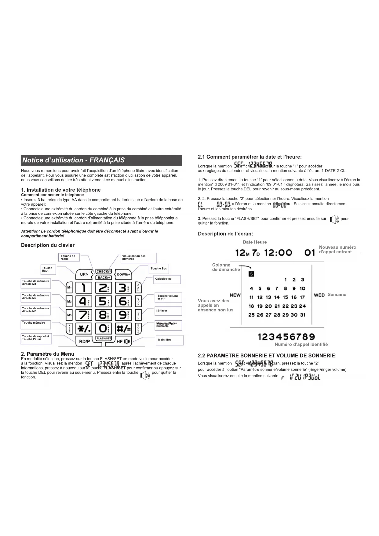 Calculator Volume/VIP Delete Musiconhold Handsfree Redial/Pause Memorystorekey One‐touchmemory One‐touchmemory One‐touchmemory Callback ReviewTel number Backward Upward Notice d’utilisation - FRANÇAIS Nous vous remercions pour avoir fait l’acquisition d’un téléphone laire avec identication de l’appelant. Pour vous assurer une complète satisfaction d’utilisation de votre appareil, nous vous conseillons de lire très attentivement ce manuel d’instruction.