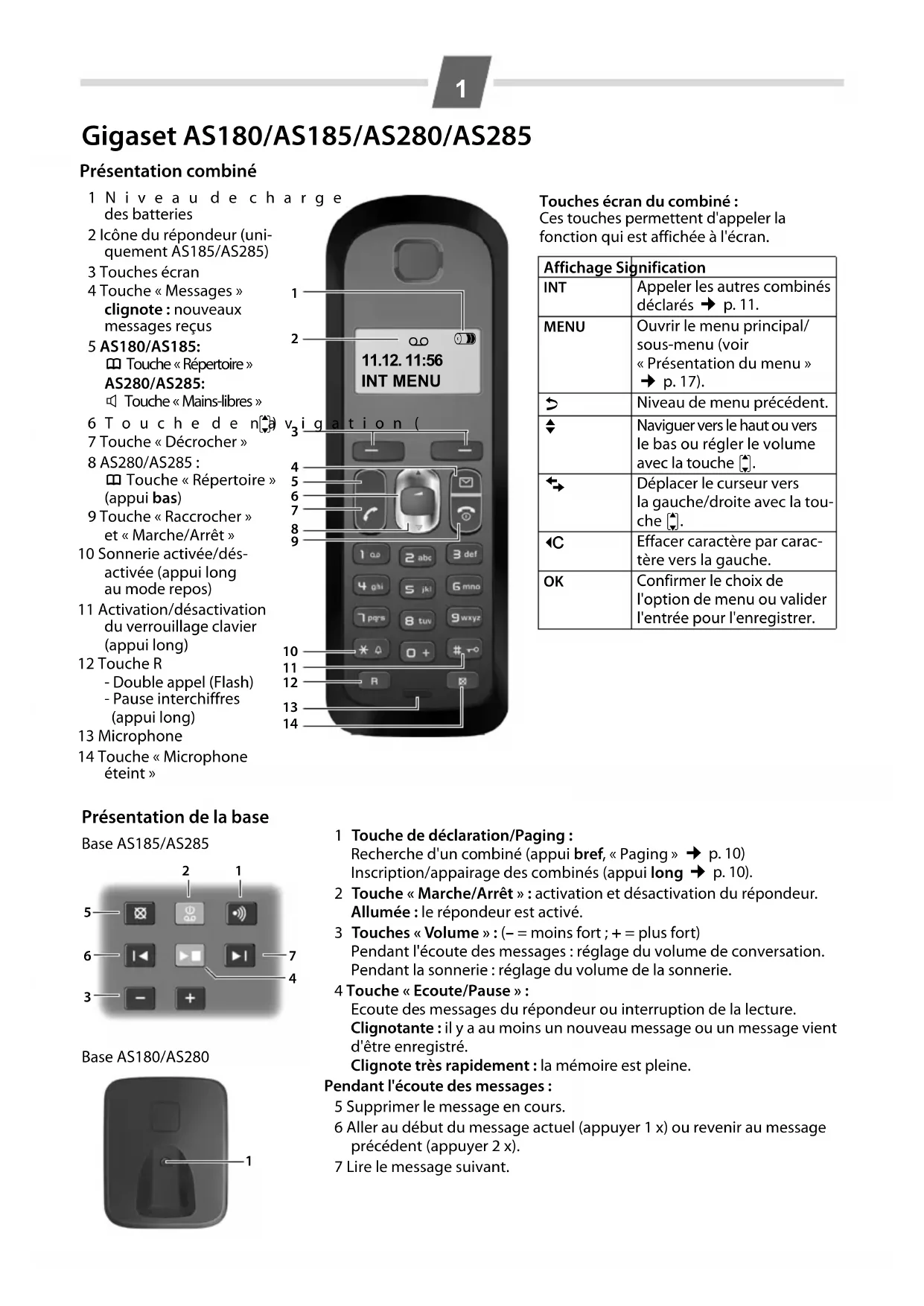 1 au répondeur (en mode veille, la maintenir enfon- cée pour composer).3-2 Activation Activation/désactivation du répondeur 3-3 Filtrage appel 3-3-1 Combiné Pendant l’enregistrement d’un message, vous pouvez écouter ce dernier sur le haut-parleur du combiné (uniquement AS285). 3-3-2 Base Pendant l’enregistrement d’un message, vous pouvez écouter ce dernier sur le haut-parleur de la base. 3-4 Annonces 3-4-1 Enreg. annonce ¢ p. 9
