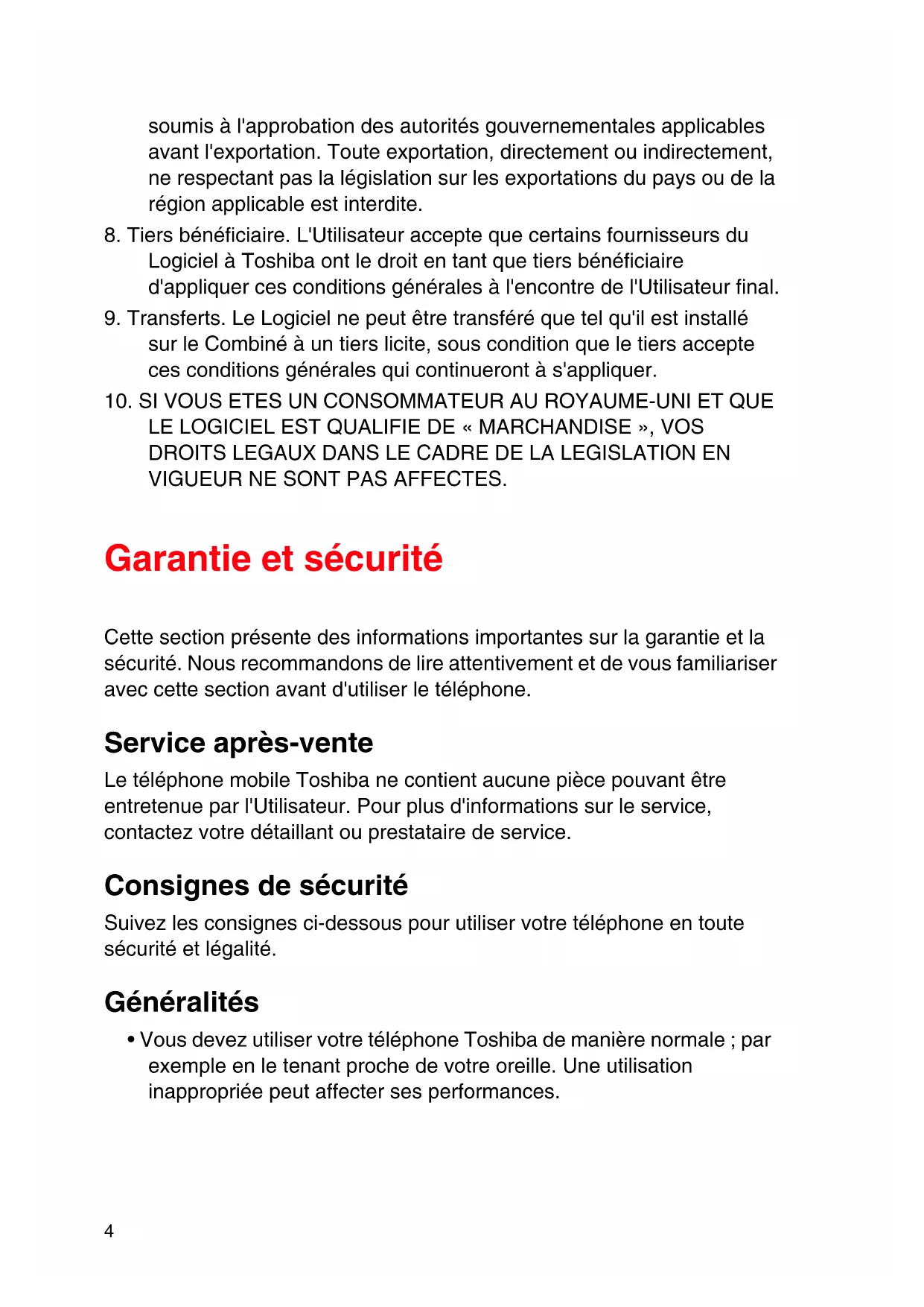 TOSHIBA CORPORATION REMARQUE IMPORTANTE : LISEZ LES PRESENTES CONDITIONS AVANT D'UTILISER VOTRE TELEPHONE MOBILE CAR TOUTE TENTATIVE D'UTILISATION DE LOGICIELS DU COMBINE FOURNI ENTRAINE L'ACCEPTATION DES CONDITIONS DU CONTRAT DE LICENCE DE L'UTILISATEUR FINAL. SI VOUS REJETTEZ OU N'ACCEPTEZ PAS L'ENSEMBLE DES CONDITIONS DE CE CONTRAT DE LICENCE DE L'UTILISATEUR FINAL, NE TENTEZ PAS D'ACCEDER AUX LOGICIELS FOURNIS OU DE LES UTILISER.