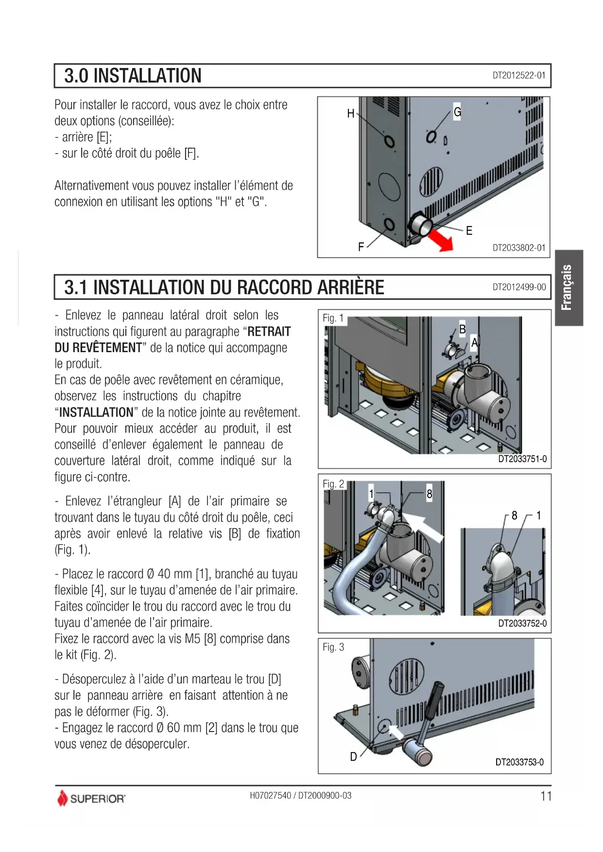 "INSTALLATION" de la notice jointe au revêtement. Pour pouvoir mistrés acceder au produit, il est conseilé d'enlever également le panneau de couverture létal croit, comme indiqué sur la figure ci-contre. - Enlevez l'étrangleur [A] de l'air primaire se trouvant dans le tuyau du côté croit du poèle, ceci après avoir enlevé la relative vis [B] de fixation (Fig. 1).