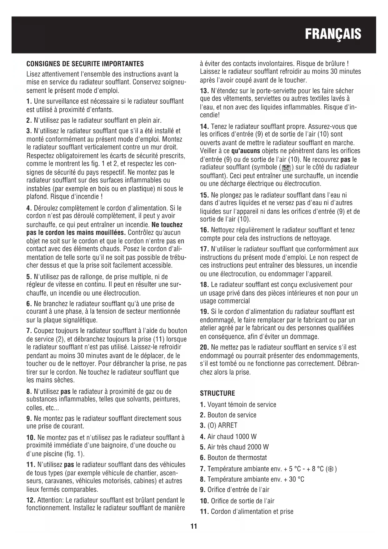 11. N'utilisez pas le radiateur soufflant dans des véhicules