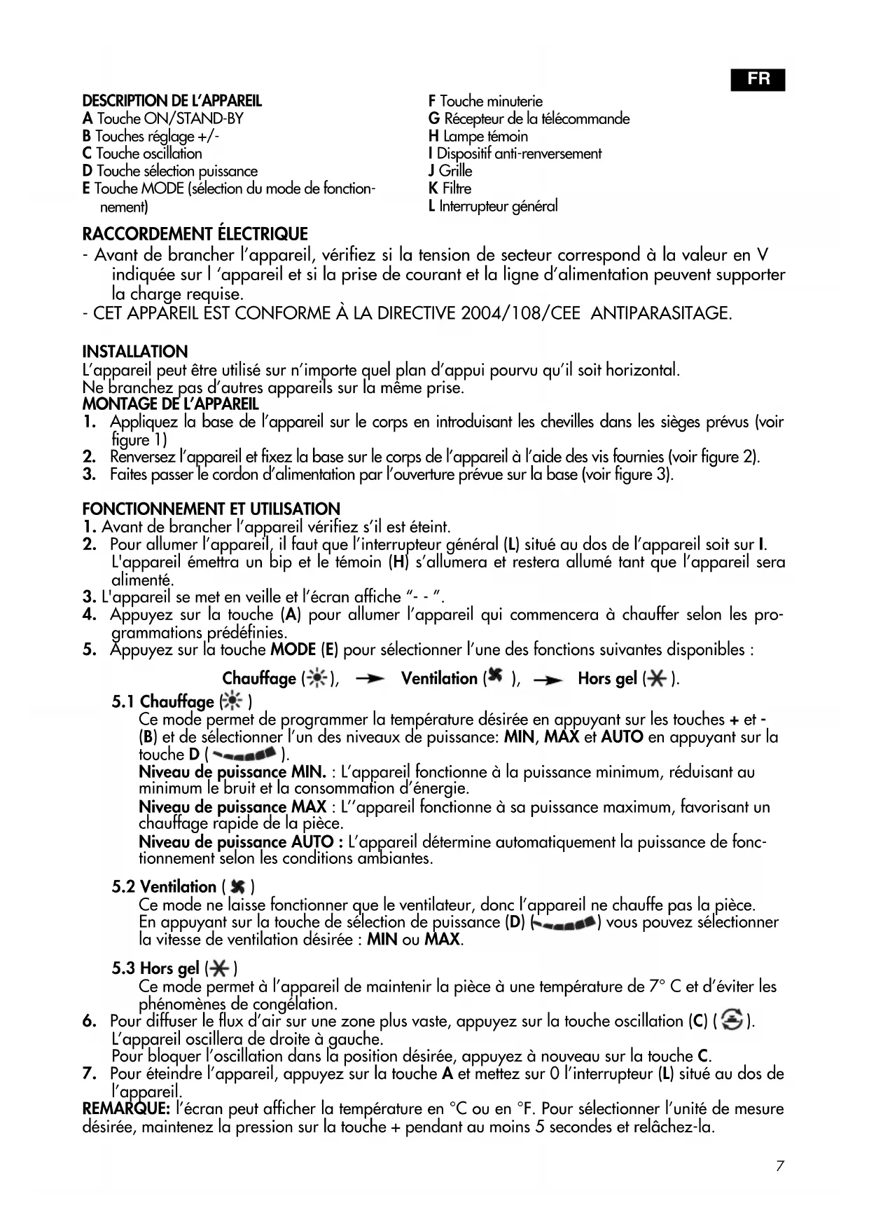 - CET APPAREIL EST CONFORME À LA DIRECTIVE 2004/108/CEE ANTIPARASITAGE.