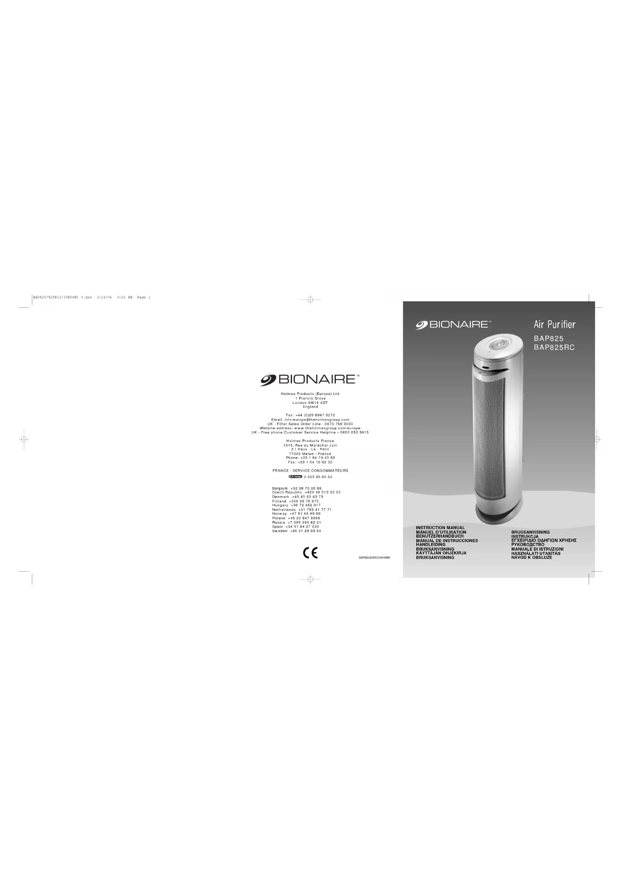 BAP825 - Purificateur d'air BIONAIRE - Notice d'utilisation et mode d'emploi gratuit
