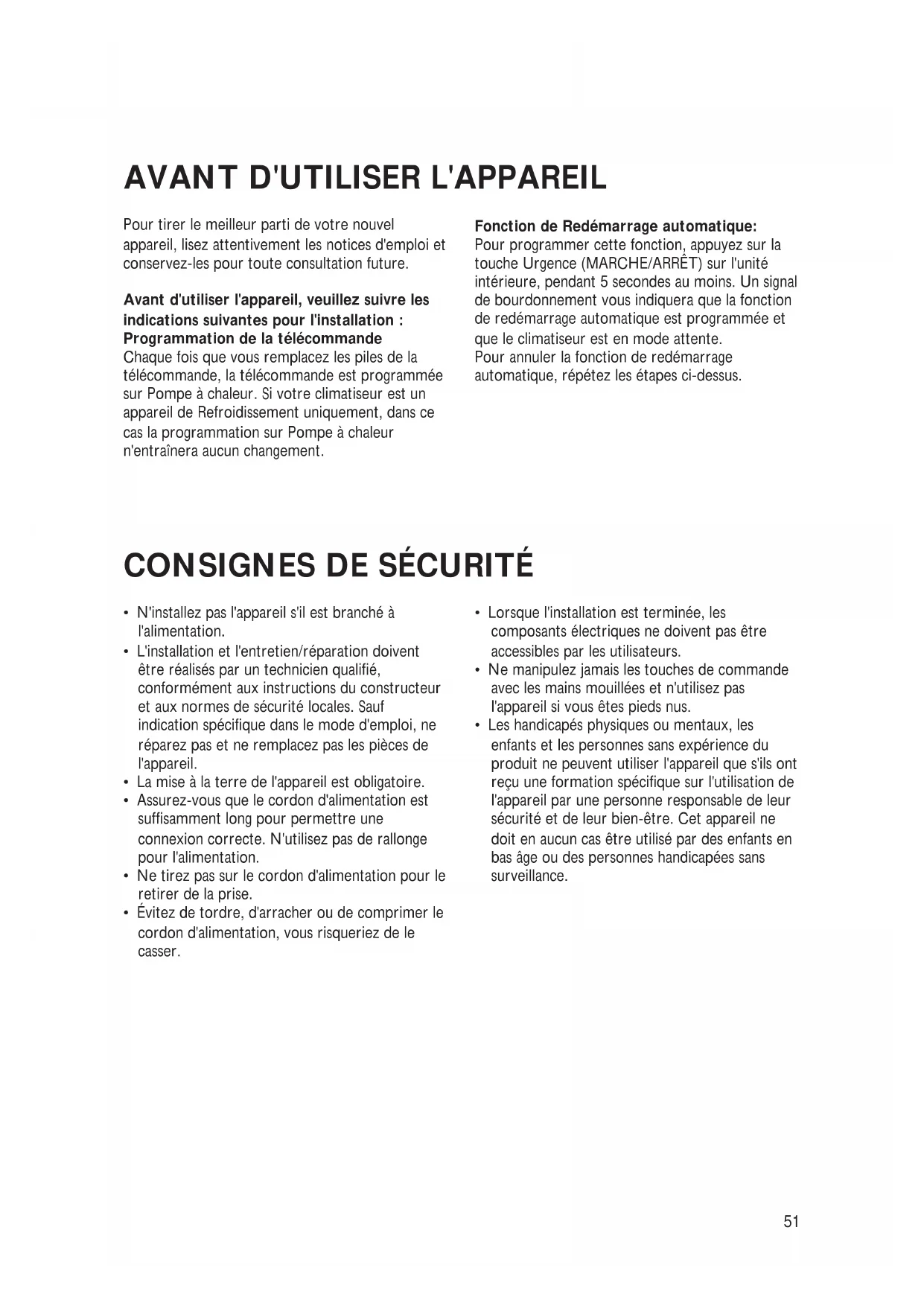 Pour tirer le meilleur parti de votre nouvel appareil, lisez attentivement les notices d'emploi et conservez-les pour toute consultation future. Avant d'utiliser l'appareil, veuillez suivre les indications suivantes pour l'installation : Programmation de la télécommande Chaque fois que vous remplacez les piles de la télécommande, la télécommande est programmée sur Pompe à chaleur. Si votre climatiseur est un appareil de Refroidissement uniquement, dans ce cas la programmation sur Pompe à chaleur n'entraînera aucun changement. Fonction de Redémarrage automatique: Pour programmer cette fonction, appuyez sur la touche Urgence (MARCHE/ARRÊT) sur l'unité intérieure, pendant 5 secondes au moins. Un signal de bourdonnement vous indiquera que la fonction de redémarrage automatique est programmée et que le climatiseur est en mode attente. Pour annuler la fonction de redémarrage automatique, répétez les étapes ci-dessus.
