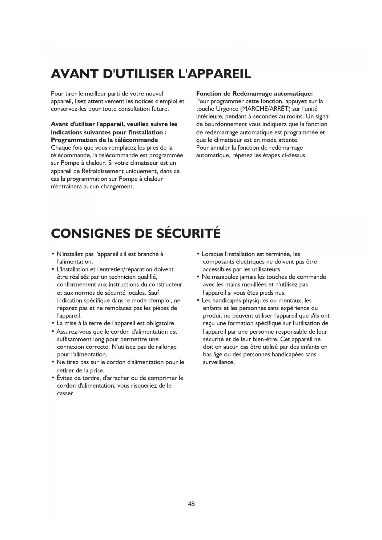 Pour tirer le meilleur parti de votre nouvel appareil, lisez attentivement les notices d'emploi et conservez-les pour toute consultation future. Avant d'utiliser l'appareil, veuillez suivre les indications suivantes pour l'installation : Programmation de la télécommande Chaque fois que vous remplacez les piles de la télécommande, la télécommande est programmée sur Pompe à chaleur. Si votre climatiseur est un appareil de Refroidissement uniquement, dans ce cas la programmation sur Pompe à chaleur n'entraînera aucun changement. Fonction de Redémarrage automatique: Pour programmer cette fonction, appuyez sur la touche Urgence (MARCHE/ARRÊT) sur l'unité intérieure, pendant 5 secondes au moins. Un signal de bourdonnement vous indiquera que la fonction de redémarrage automatique est programmée et que le climatiseur est en mode attente. Pour annuler la fonction de redémarrage automatique, répétez les étapes ci-dessus.