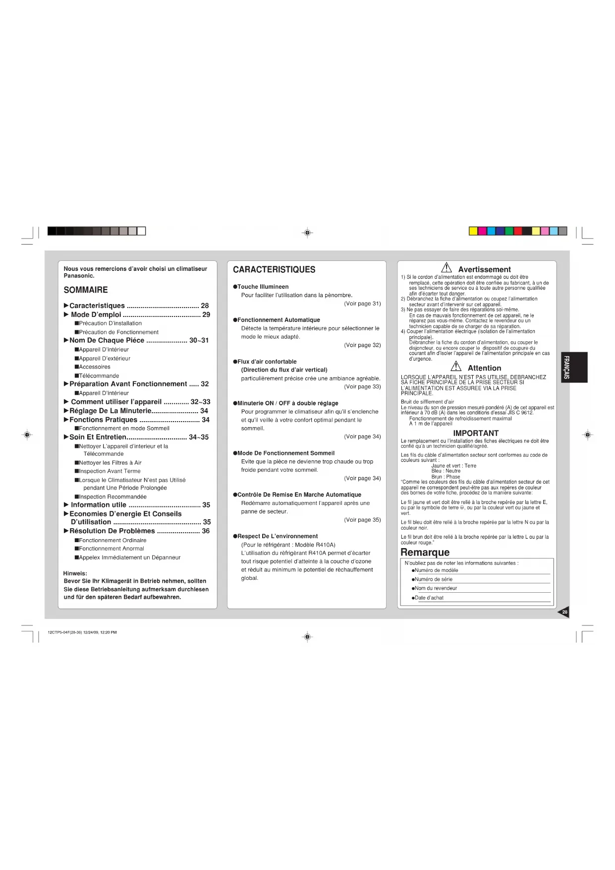 FRANÇAIS Nous vous remercions d’avoir choisi un climatiseurPanasonic. SOMMAIRE
