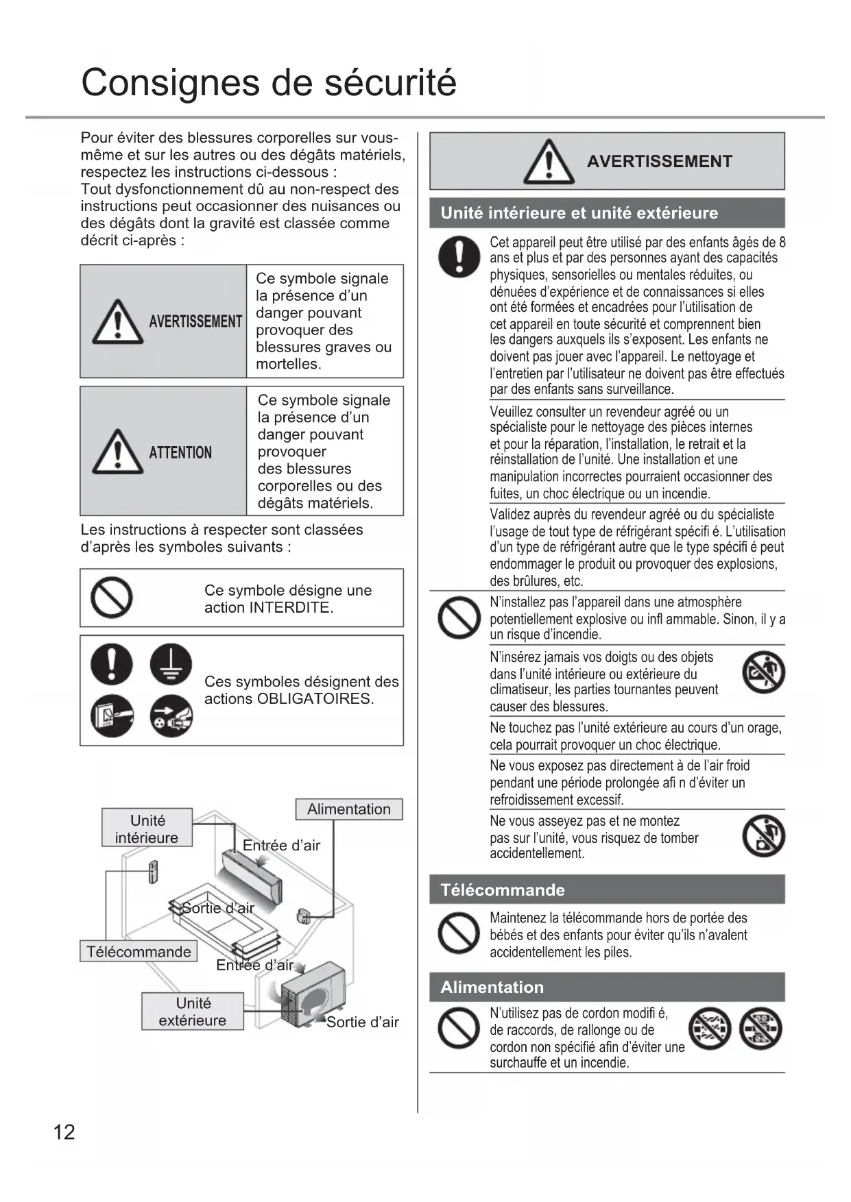 AVERTISSEMENT Unité intérieure et unité extérieure