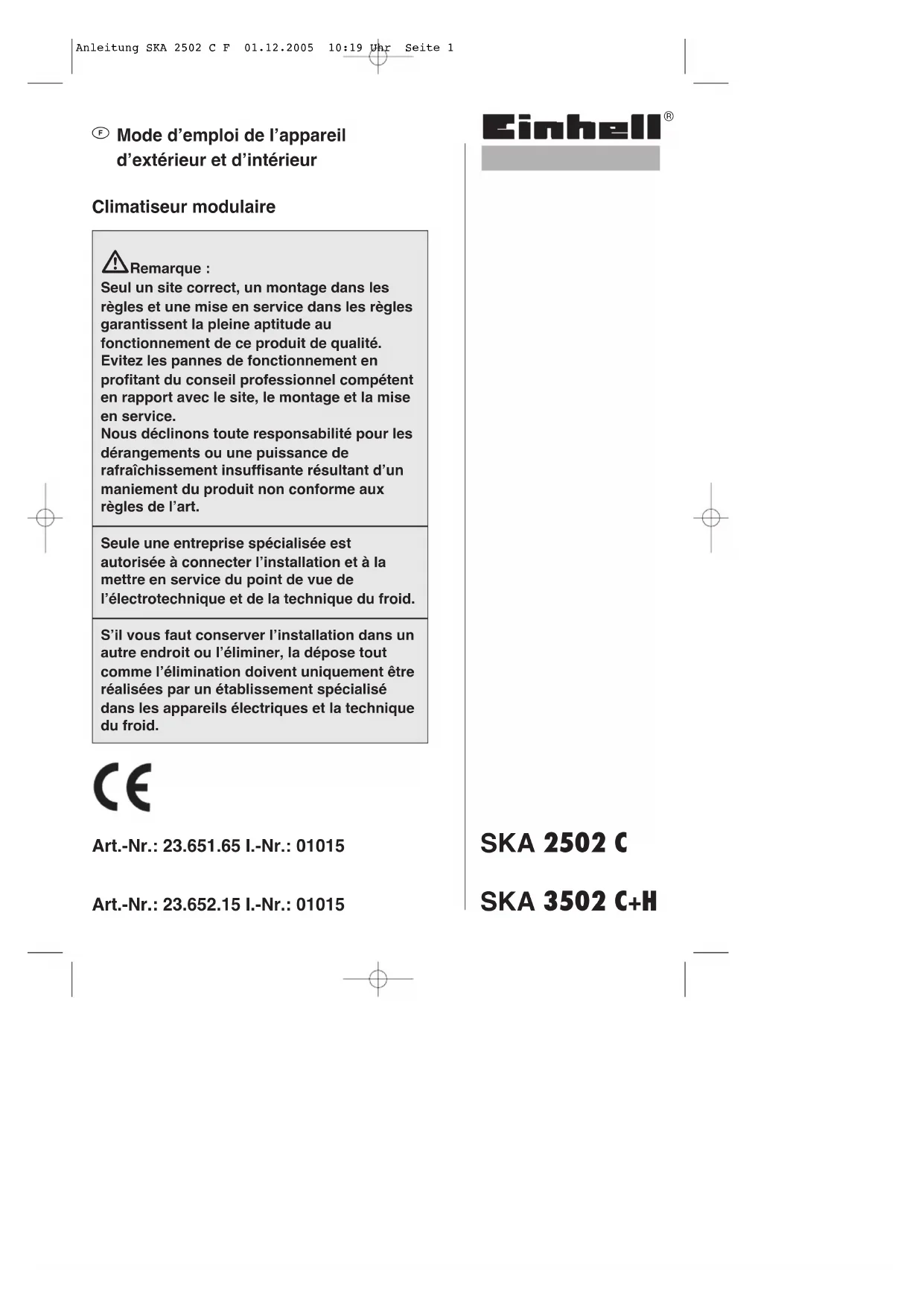 SKA 2502 C - Climatisation EINHELL - Notice d'utilisation et mode d'emploi gratuit