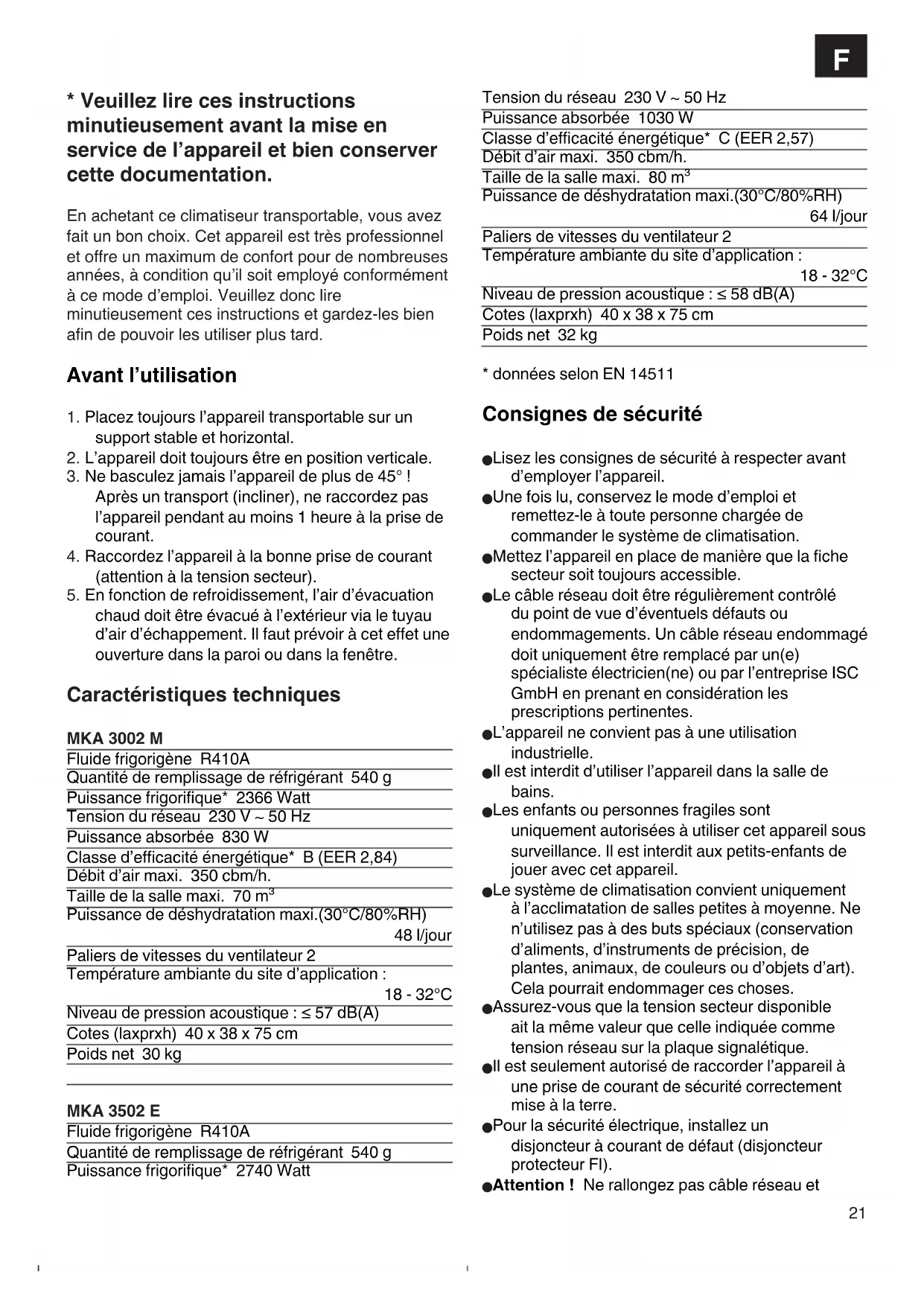 chaud doit être évacué à l’extérieur via le tuyau d’air d’échappement. Il faut prévoir à cet effet une ouverture dans la paroi ou dans la fenêtre. Caractéristiques techniques MKA 3002 M Fluide frigorigène R410A Quantité de remplissage de réfrigérant 540 g Puissance frigorifique* 2366 Watt Tension du réseau 230 V ~ 50 Hz Puissance absorbée 830 W Classe d’efficacité énergétique* B (EER 2,84) Débit d’air maxi. 350 cbm/h. Taille de la salle maxi. 70 m³ Puissance de déshydratation maxi.(30°C/80%RH) 48 l/jour Paliers de vitesses du ventilateur 2 Température ambiante du site d’application :