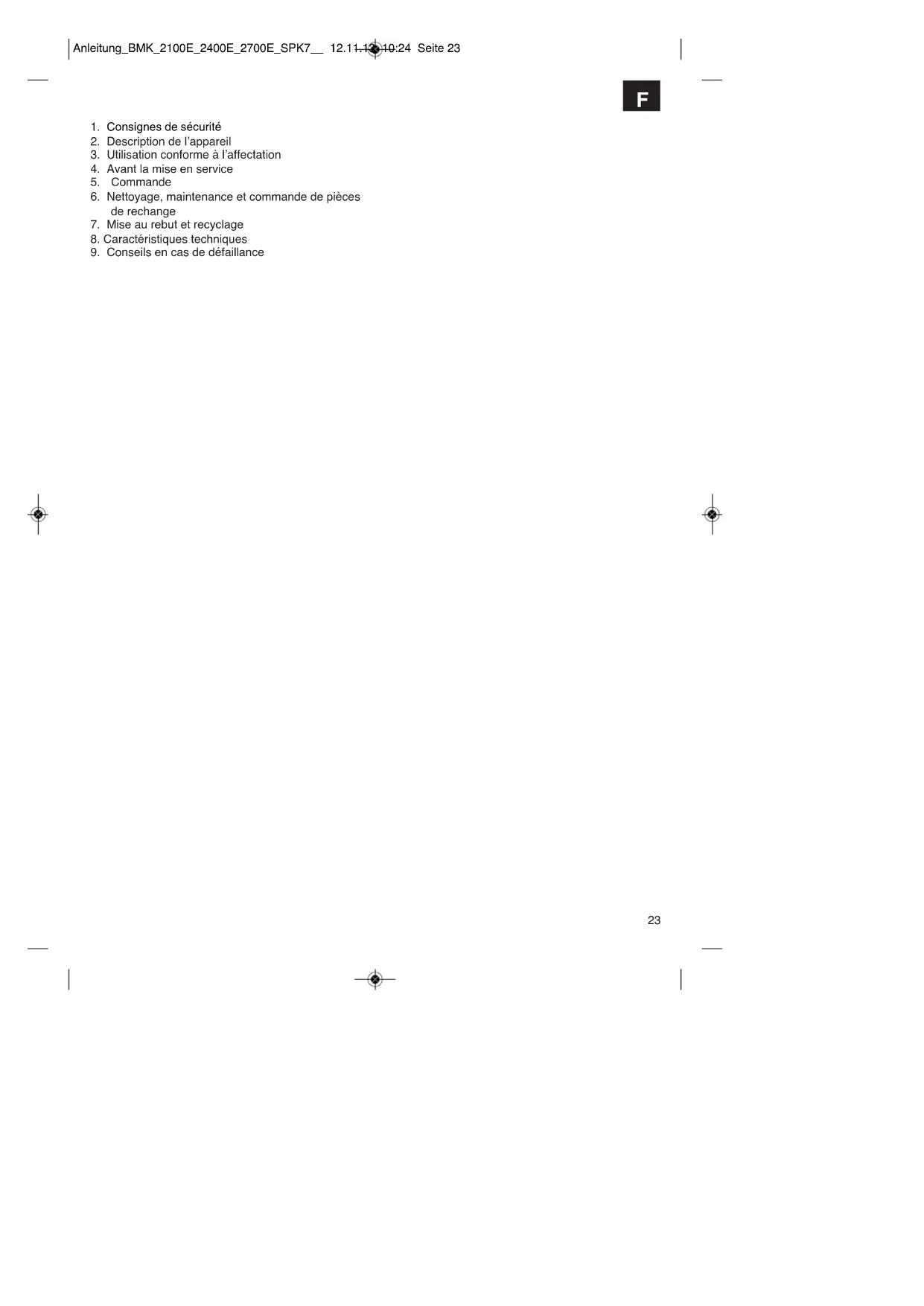 Lʼappareil se trouve dans un emballage permettant dʼéviter les dommages dus au transport. Cet emballage est une matière première et peut donc être réutilisé ultérieurement ou être réintroduit dans le circuit des matières premières. Lʼappareil et ses accessoires sont en matériaux divers, comme par ex. des métaux et matières plastiques. Eliminez les composants défectueux dans les systèmes dʼélimination des déchets spéciaux. Renseignez-vous dans un commerce spécialisé ou auprès de lʼadministration de votre commune ! Anleitung_BMK_2100E_2400E_2700E_SPK7__ 12.11.13 10:24 Seite 29F