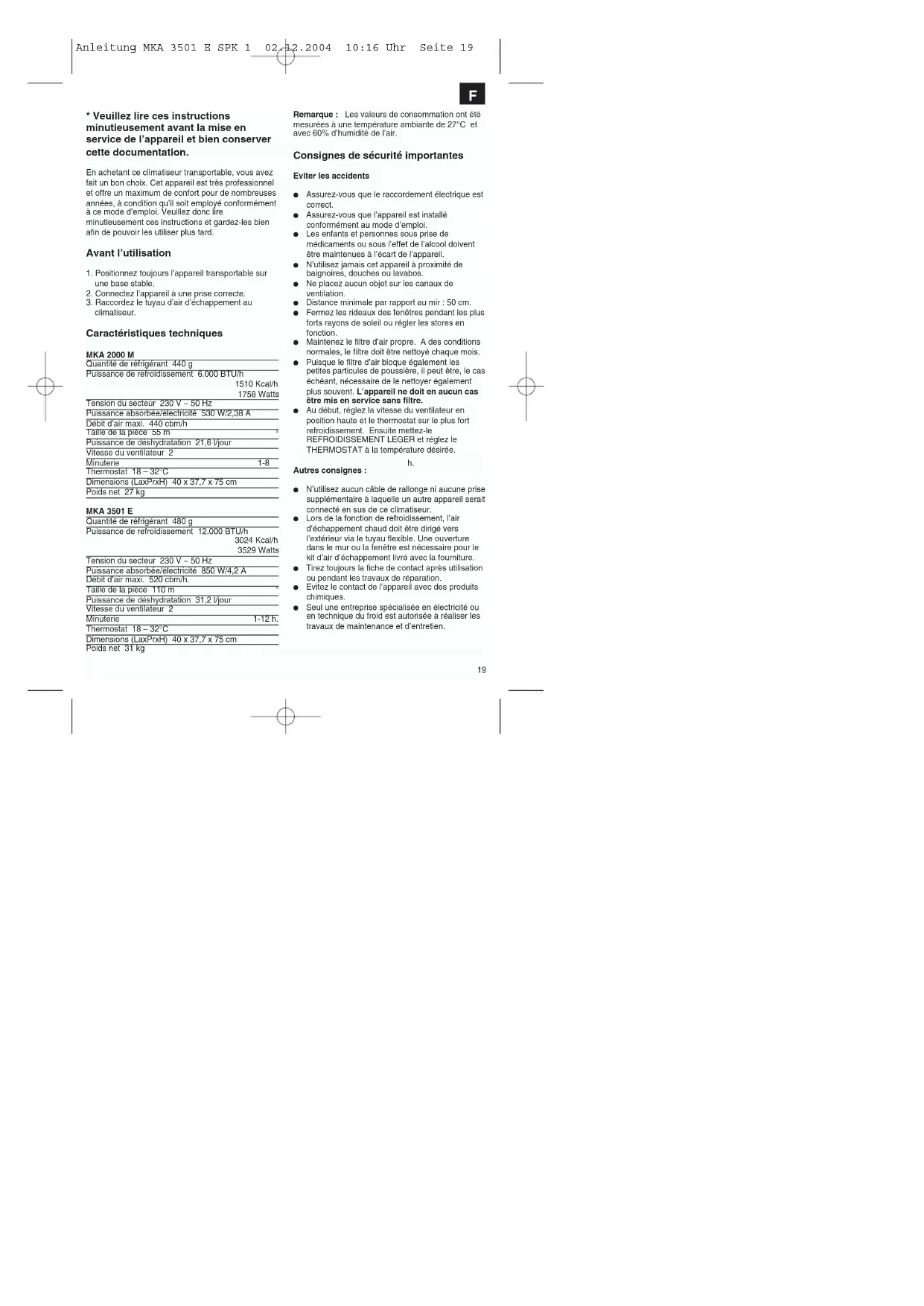 Anleitung MKA 3501 E SPK 1 02.12.2004 10:16 Uhr Seite 18* Veuillez lire ces instructions minutieusement avant la mise en service de l’appareil et bien conserver cette documentation. En achetant ce climatiseur transportable, vous avez fait un bon choix. Cet appareil est très professionnel et offre un maximum de confort pour de nombreuses années, à condition qu’il soit employé conformément à ce mode d’emploi. Veuillez donc lire minutieusement ces instructions et gardez-les bien afin de pouvoir les utiliser plus tard. Avant l’utilisation