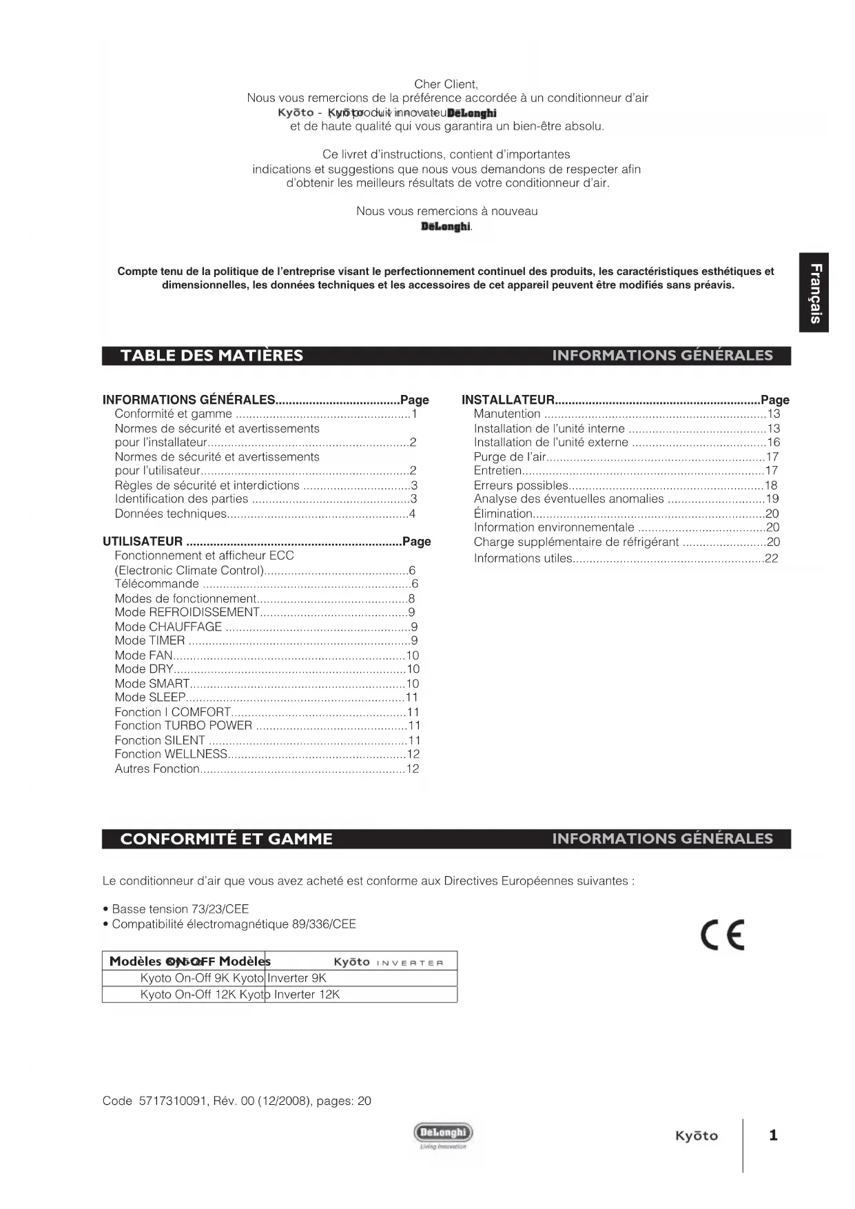 Compte tenu de la politique de l’entreprise visant le perfectionnement continuel des produits, les caractéristiques esthétiques et dimensionnelles, les données techniques et les accessoires de cet appareil peuvent être modiés sans préavis. Modèles ON-OFF Modèles Kyoto On-Off 9K Kyoto Inverter 9K Kyoto On-Off 12K Kyoto Inverter 12K2 NORMES DE SÉCURITÉ ET AVERTISSEMENTS POUR L’INSTALLATEUR