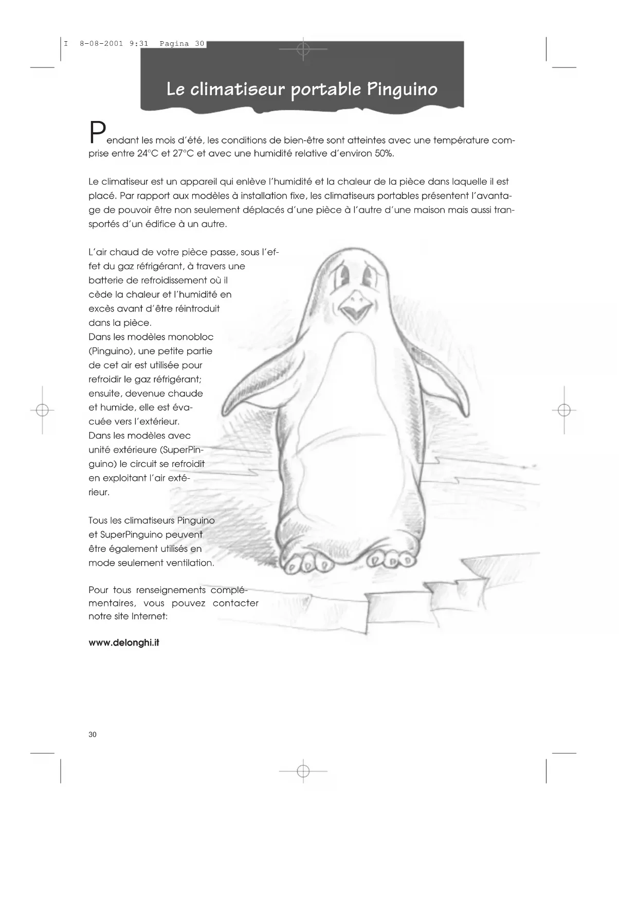I 8-08-2001 9:30 Pagina 2930 Le climatiseur portable Pinguino Pendant les mois d’été, les conditions de bien-être sont atteintes avec une température com- prise entre 24°C et 27°C et avec une humidité relative d’environ 50%. Le climatiseur est un appareil qui enlève l’humidité et la chaleur de la pièce dans laquelle il est placé. Par rapport aux modèles à installation fixe, les climatiseurs portables présentent l’avanta- ge de pouvoir être non seulement déplacés d’une pièce à l’autre d’une maison mais aussi tran- sportés d’un édifice à un autre. L’air chaud de votre pièce passe, sous l’ef- fet du gaz réfrigérant, à travers une batterie de refroidissement où il cède la chaleur et l’humidité en excès avant d’être réintroduit dans la pièce. Dans les modèles monobloc (Pinguino), une petite partie de cet air est utilisée pour refroidir le gaz réfrigérant; ensuite, devenue chaude et humide, elle est éva- cuée vers l’extérieur. Dans les modèles avec unité extérieure (SuperPin- guino) le circuit se refroidit en exploitant l’air exté- rieur. Tous les climatiseurs Pinguino et SuperPinguino peuvent être également utilisés en mode seulement ventilation. Pour tous renseignements complé- mentaires, vous pouvez contacter notre site Internet: www.delonghi.it I 8-08-2001 9:31 Pagina 3031 FRANÇAIS Avertissements