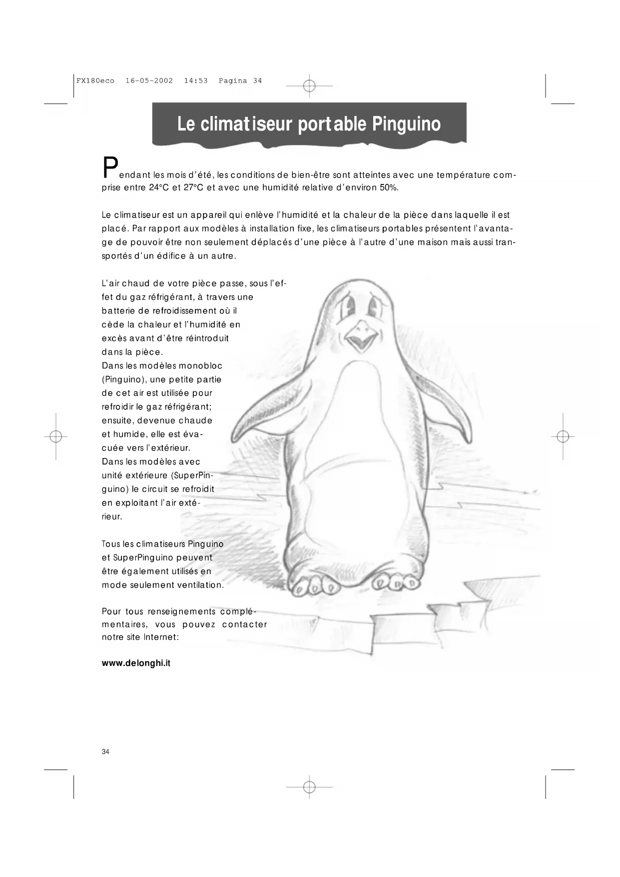 FX180eco 16-05-2002 14:53 Pagina 3334 Le climatiseur portable Pinguino Pendant les mois d’été, les conditions de bien-être sont atteintes avec une température com- prise entre 24°C et 27°C et avec une humidité relative d’environ 50%. Le climatiseur est un appareil qui enlève l’humidité et la chaleur de la pièce dans laquelle il est placé. Par rapport aux modèles à installation fixe, les climatiseurs portables présentent l’avanta- ge de pouvoir être non seulement déplacés d’une pièce à l’autre d’une maison mais aussi tran- sportés d’un édifice à un autre. L’air chaud de votre pièce passe, sous l’ef- fet du gaz réfrigérant, à travers une batterie de refroidissement où il cède la chaleur et l’humidité en excès avant d’être réintroduit dans la pièce. Dans les modèles monobloc (Pinguino), une petite partie de cet air est utilisée pour refroidir le gaz réfrigérant; ensuite, devenue chaude et humide, elle est éva- cuée vers l’extérieur. Dans les modèles avec unité extérieure (SuperPin- guino) le circuit se refroidit en exploitant l’air exté- rieur. Tous les climatiseurs Pinguino et SuperPinguino peuvent être également utilisés en mode seulement ventilation. Pour tous renseignements complé- mentaires, vous pouvez contacter notre site Internet: www.delonghi.it FX180eco 16-05-2002 14:53 Pagina 3435 FRANÇAIS Avertissements