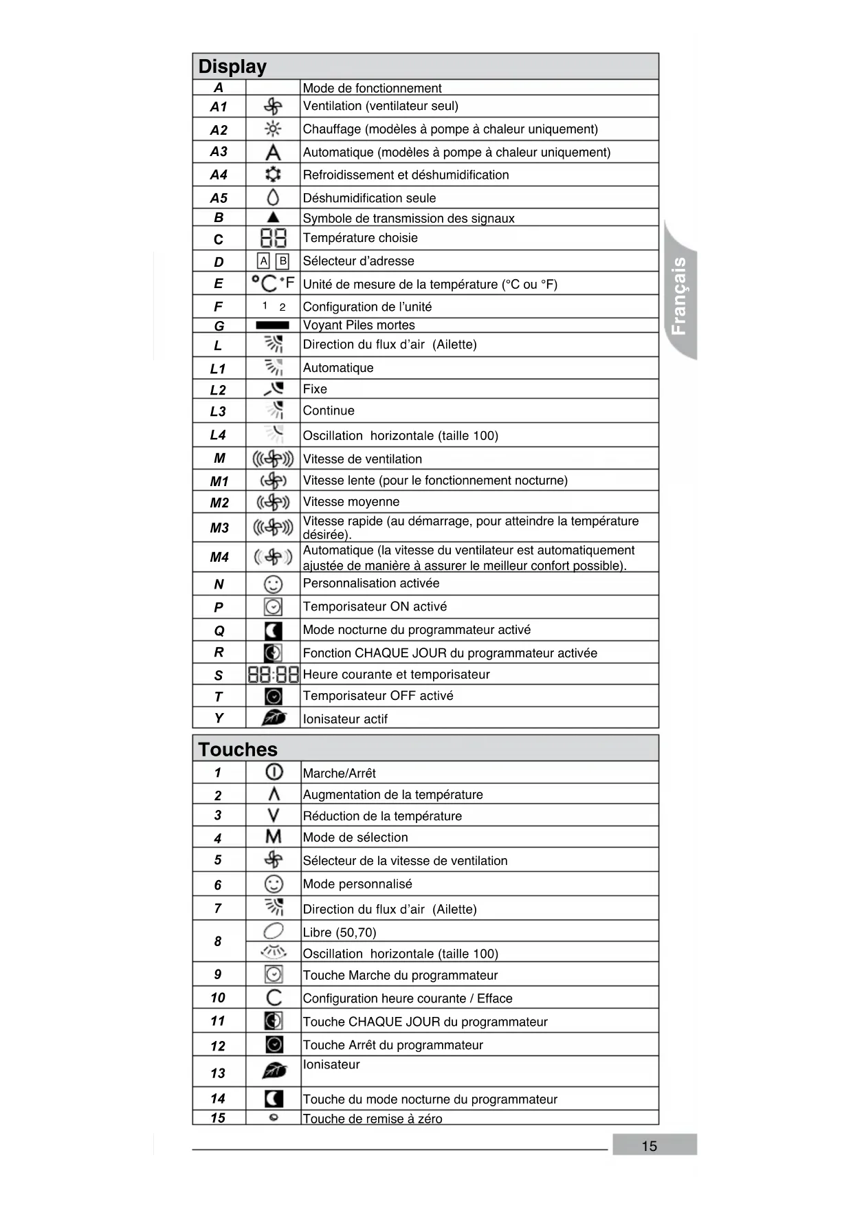 Continue Oscillation horizontale (taille 100) Vitesse de ventilation Vitesse lente (pour le fonctionnement nocturne) Vitesse moyenne Vitesse rapide (au démarrage, pour atteindre la température désirée). Automatique (la vitesse du ventilateur est automatiquement ajustée de manière à assurer le meilleur confort possible). Personnalisation activée Temporisateur ON activé Mode nocturne du programmateur activé Fonction CHAQUE JOUR du programmateur activée Heure courante et temporisateur Temporisateur OFF activé Ionisateur actif Touches