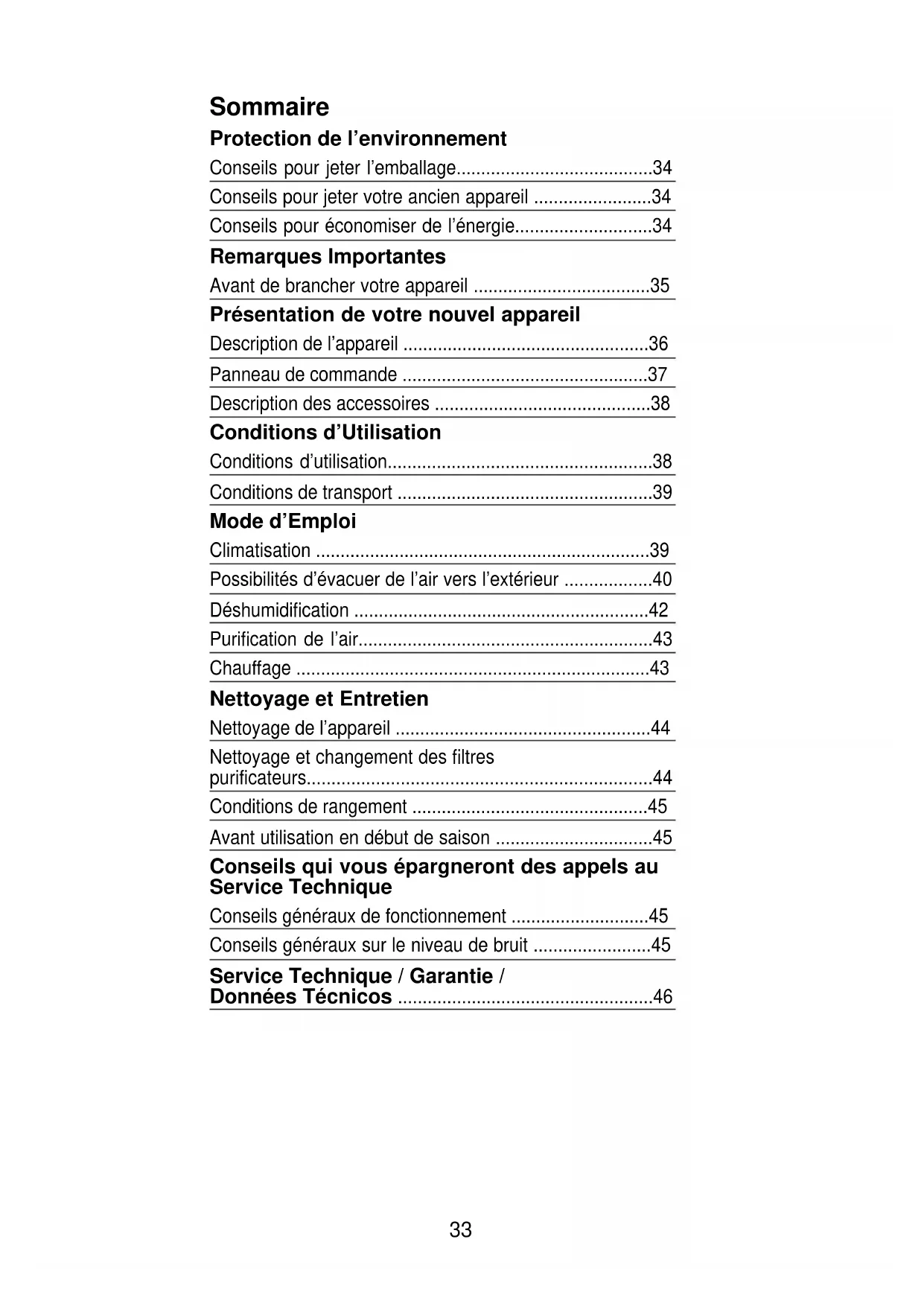 (*) The amount of water may vary when conditions in the room to be dehumidified are other than 30ºC and 80% RH.Sommaire