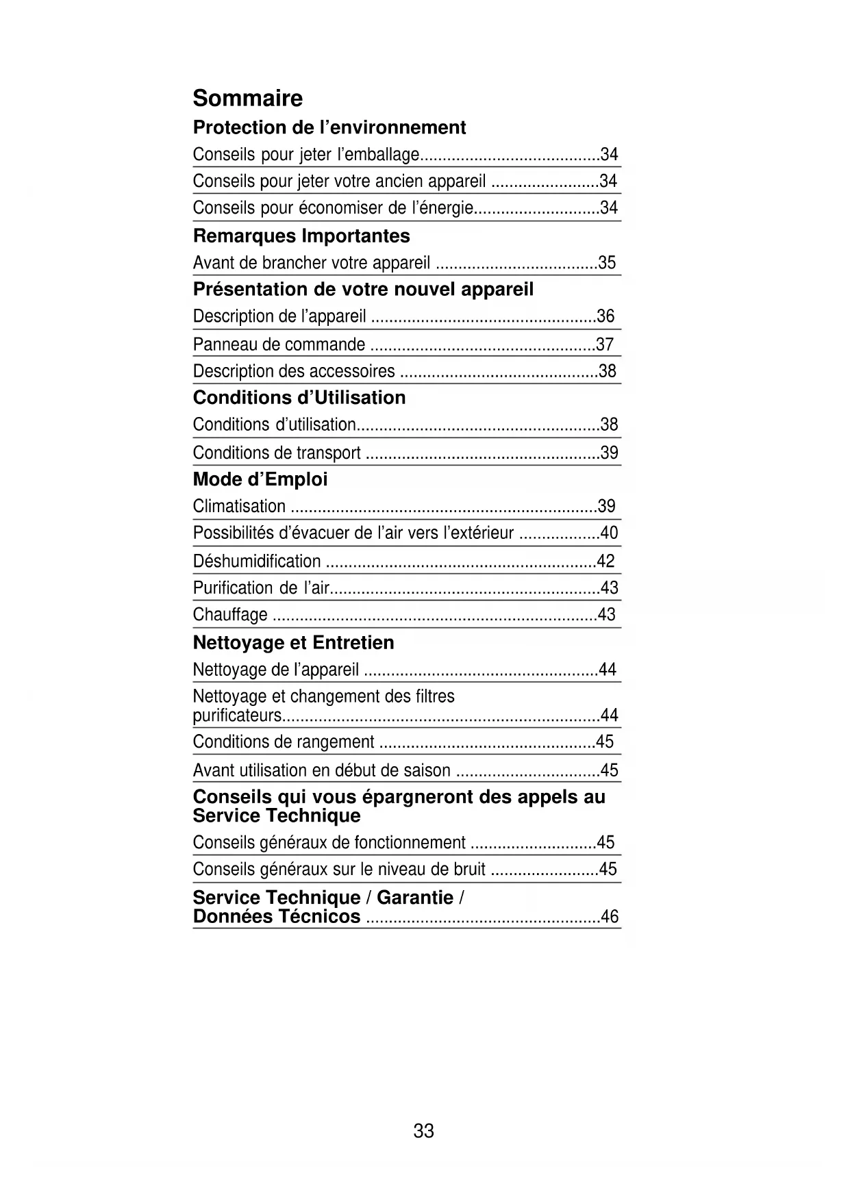 Nettoyage et Entretien Nettoyage de l’appareil ❏ Par mesure de sécurité, avant de nettoyer l’appareil, il est recommandé de le débrancher. ❏ L’appareil peut être nettoyé avec un chiffon ou une éponge, de l’eau tiède et un détergent doux. ❏ N’utilisez jamais d’eau chaude (à plus de 40ºC), de produit blanchissant, de benzine, d’essence, d’acides, d’éponges abrasives, de brosses ou de détergents abrasifs et évitez que de l’eau n’entre dans l’appareil. ❏ Ne nettoyez pas l’appareil avec un tuyau d’arrosage. Nettoyage et changement des filtres purificateurs Pour ouvrir la porte frontale de l´appareil (il n’est pas nécessaire de la retirer), il suffit d’appuyer sur les clips latéraux de celle-ci, (Fig. 28, 1.) et de tirer vers vous. (Fig. 28, 2.). La porte comporte une butée jusqu’à laquelle elle s’ouvre sans risque de tomber. Tous les modèles comportent un filtre d’air de base qu’il faut nettoyer au bout d’un certain temps, Fig. 29. Pour cela, il suffit d’appuyer sur le clip situé sur la partie supérieure et de le retirer, Fig. 30. Pour le laver, il suffit de le passer sous l’eau courante, de le sécher et de le remettre à sa place. Filtre de base lavable Filtre purificateur Fig. 28 Fig. 29 Fig. 30 Fig. 3145 Nettoyage et Entretien Pour cela, il suffit d’ouvrir la porte jusqu’à la butée de sécurité (la porte reste ouverte avec une légère inclinaison ; Fig. 28) et de tirer fortement vers vous. Pour la remettre en place, faites coïncider les crochets inférieurs de la porte avec les orifices de la carcasse de l’appareil jusqu’à ce que les crochets s’emboîtent dans les clips de la carcasse. Conditions de rangement A la fin de chaque saison, pour que votre appareil occupe le moins de place possible, vous devrez mettre le tube d’évacuation en position de repos. ❏ Pour cela, pliez le tube vers l’arrière de l’appareil et attachez-le grâce au crochet diffuseur, Fig. 32 et 32. Avant utilisation en début de saison ❏ Nettoyez le filtre de l’air. ❏ Ensuite, nettoyez le couvercle et les grilles si nécessaire. Fig. 32 Fig. 33 Conseils qui vous épargneront des appels au Service Technique Conseils généraux de fonctionnement Que faire si ? ... ... l’appareil ne fonctionne pas … ❏ Vérifiez que la prise est branchée. ❏ Vérifiez que le sélecteur de fonctions n’est pas en position inactive . ❏ Vérifiez qu’il y a de l’énergie sur le secteur et qu’aucun fusible n’a fondu. ❏ Positionnez le thermostat sur une température inférieure. ... l’appareil ne fonctionne pas et le témoin lumineux, indiquant que le réservoir d’eau condensée est plein, est allumé … ❏ Placez l’appareil sur une surface plane. Si le témoin reste allumé, videz le réservoir d’eau interne de l’appareil. (Voir instructions dans “Climatisation”). ... l’appareil ne refroidit pas suffisamment ... ❏ Vérifiez que les raccordements du tube expulseur d’air chaud sont corrects. ❏ Vérifiez que le tube d’expulsion n’est pas trop plié et qu’il ne mesure pas plus de 140 cm. ❏ Vérifiez que le bouchon du tube d’évacuation de l’eau est placé sur ce tube. ❏ Placez la ventouse pour que l’ouverture de la fenêtre soit la plus petite possible. ❏ Fermez les volets afin de minimiser la radiation solaire. ... vous voyez de l’eau dans la grille du panneau de commande ou à l’emplacement du filtre de base ... ❏ Ne vous inquiétez pas, cela est dû au fonctionnement même de l’appareil. Conseils généraux sur le niveau de bruit ... l’appareil est excessivement bruyant ... Il convient de distinguer deux types de bruits, ceux générés par le fonctionnement normal de l’appareil et ceux auxquels il est facile de r e m é d i e r. Ci-après sont décrits quelques uns de ces bruits éventuels afin de mieux les identifier.Service Technique / Garantie / Données Techniques Service Technique Si après avoir tenu compte des instructions d’utilisation, installation, spécialement ce qui est indiqué dans le chapitre "Considérations...." , votre appareil ne fonctionne pas, souvenez-vous que notre Réseau de Services Techniques est à votre disposition. Pour cela, en communiquant la panne, indiquez le modèle (E-NR) et le n° de fabrication (FD) de votre appareil, que vous pourrez lire sur la plaque de caractéristiques, Fig. 2. Garantie Dans chaque pays sont établies les conditions de garantie par les correspondantes Sociétés de Distribution. Pour plus de détails à cet effet, dirigez-vous au Distributeur qui vous a vendu l’appareil en lui facilitant le nom du modèle et le nº de fabrication. Pour toute intervention qui se produit sous garantie, il est indispensable de présenter le justificatif d’achat de l’appareil. Données Techniques