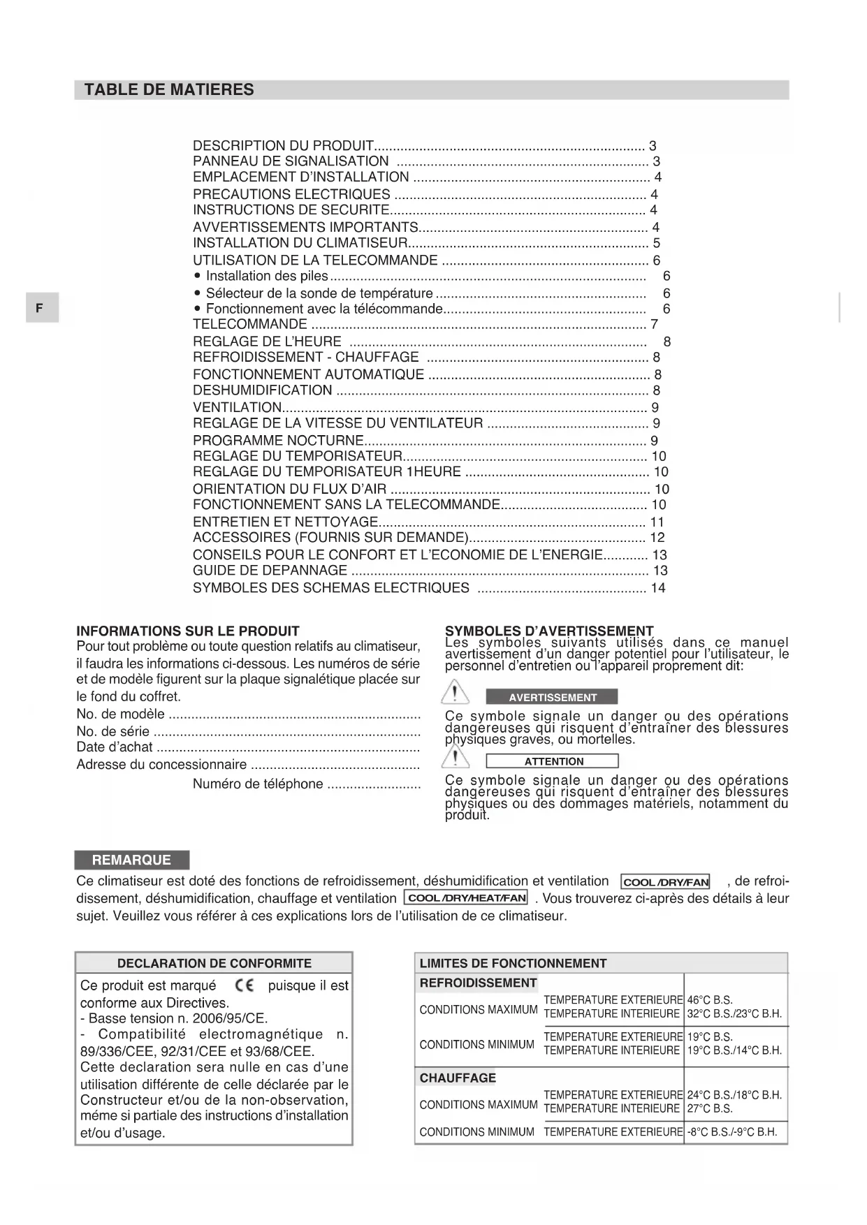 Pour tout problème ou toute question relatifs au climatiseur, il faudra les informations ci-dessous. Les numérores de série et de modele figurent sur la plaque signalétique place sur le fond du coffret.